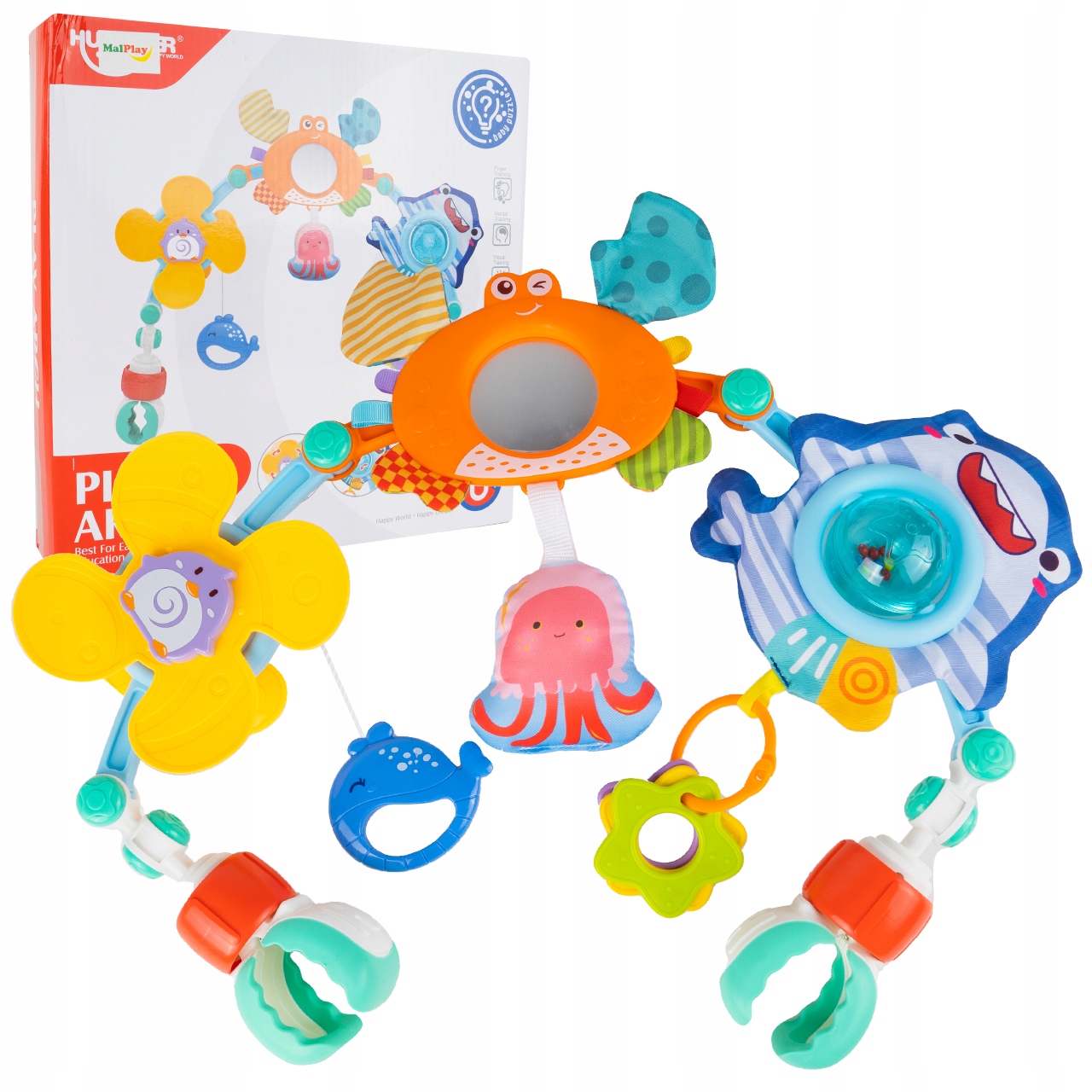 Для любителей подводных приключений представляем красочную повязку на голову с изображением моря животные. Наш продукт идеально подходит для коляски, автокресла, шезлонга, стульчика для кормления и детской кроватки и заинтересует каждого малыша. Способ сборки очень быстрый и простой! Оголовье имеет специальные защелки, которые позволяют придать ему форму в соответствии с вашими потребностями. На обоих концах имеются регулируемые крючки, с помощью которых можно прикрепить повязку к кроватке/коляске и т. д.