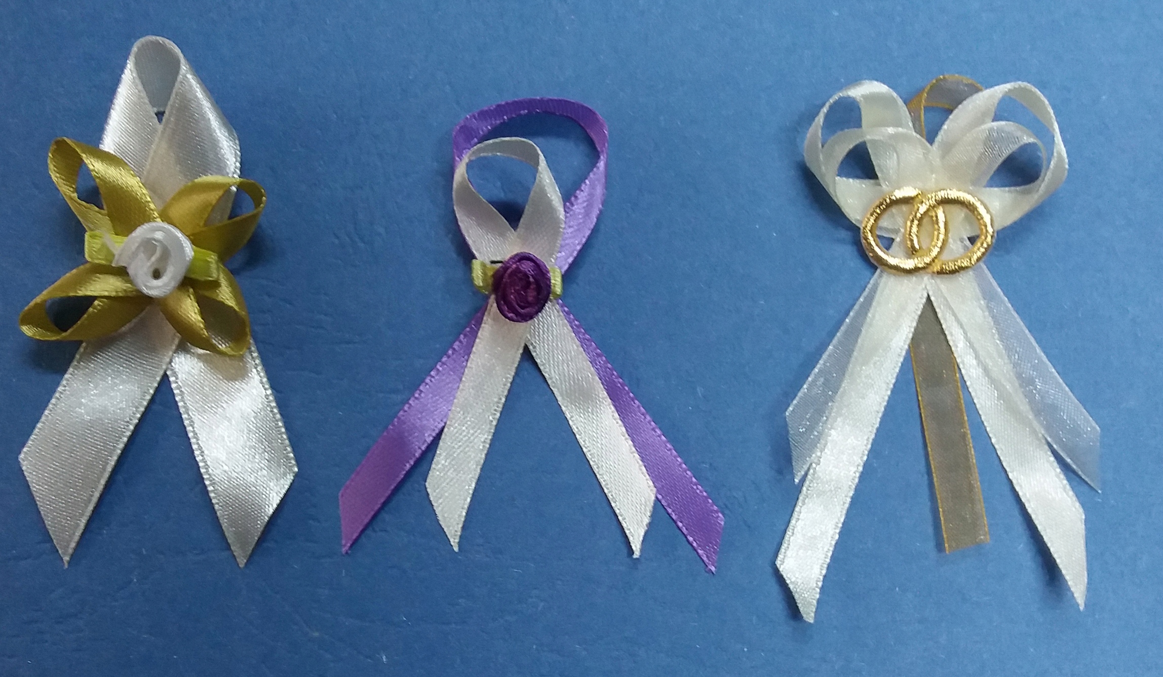 Булавки изготовлены вручную из атласной ленты шириной 0,6 см, украшены розочками, сердечками или обручальными кольцами.