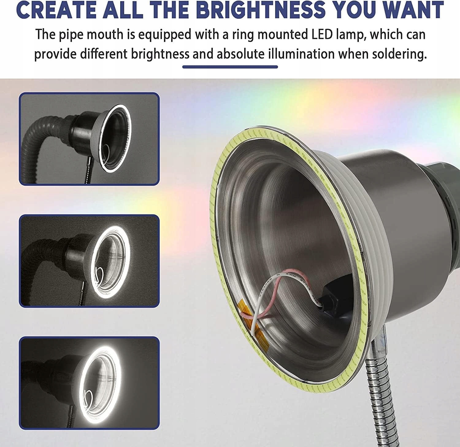 [СВЕТОДИОДНАЯ ЛАМПА] - Отверстие трубы коптильни оснащено кольцевой светодиодной лампой, которая может обеспечить абсолютное освещение при пайке некоторых электронных компонентов. В то же время вы можете регулировать яркость света, поворачивая ручку.