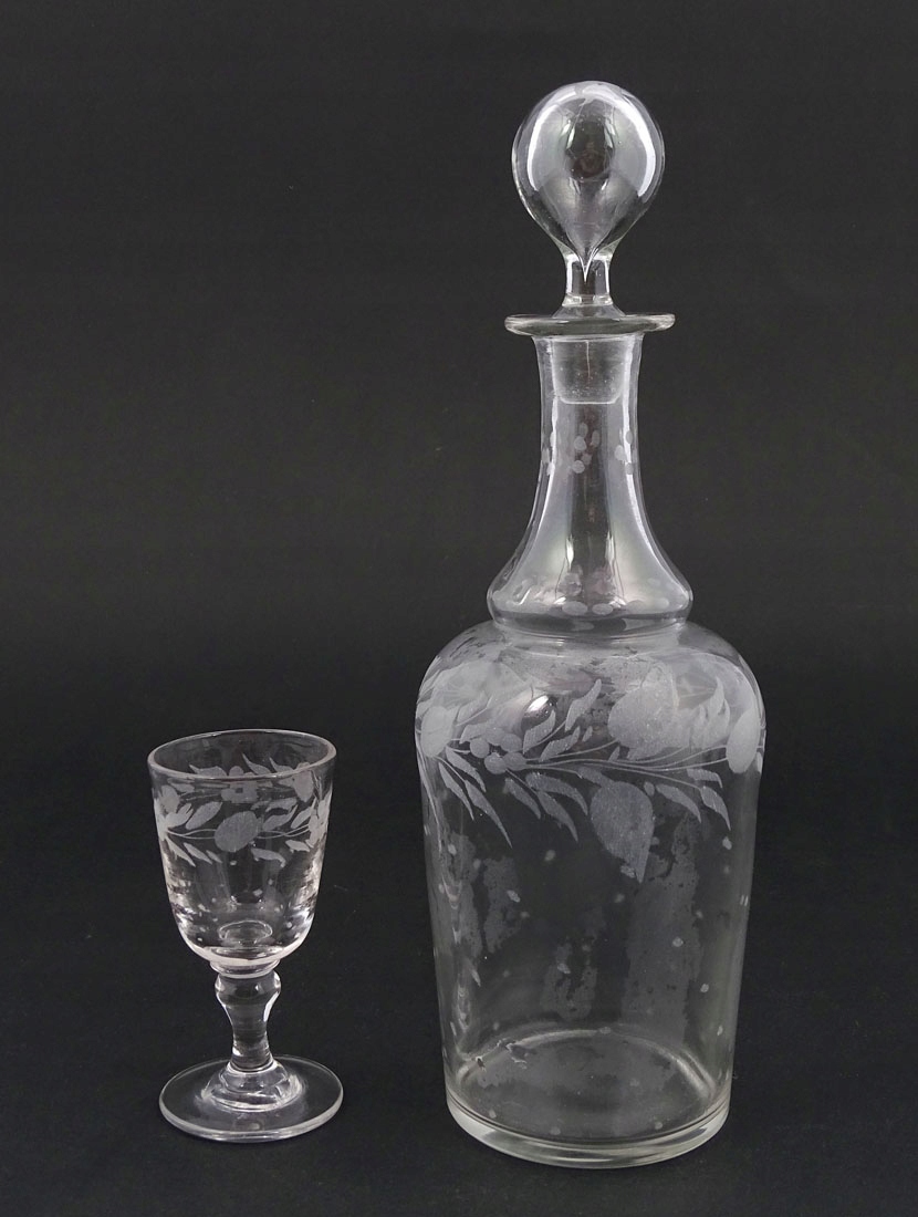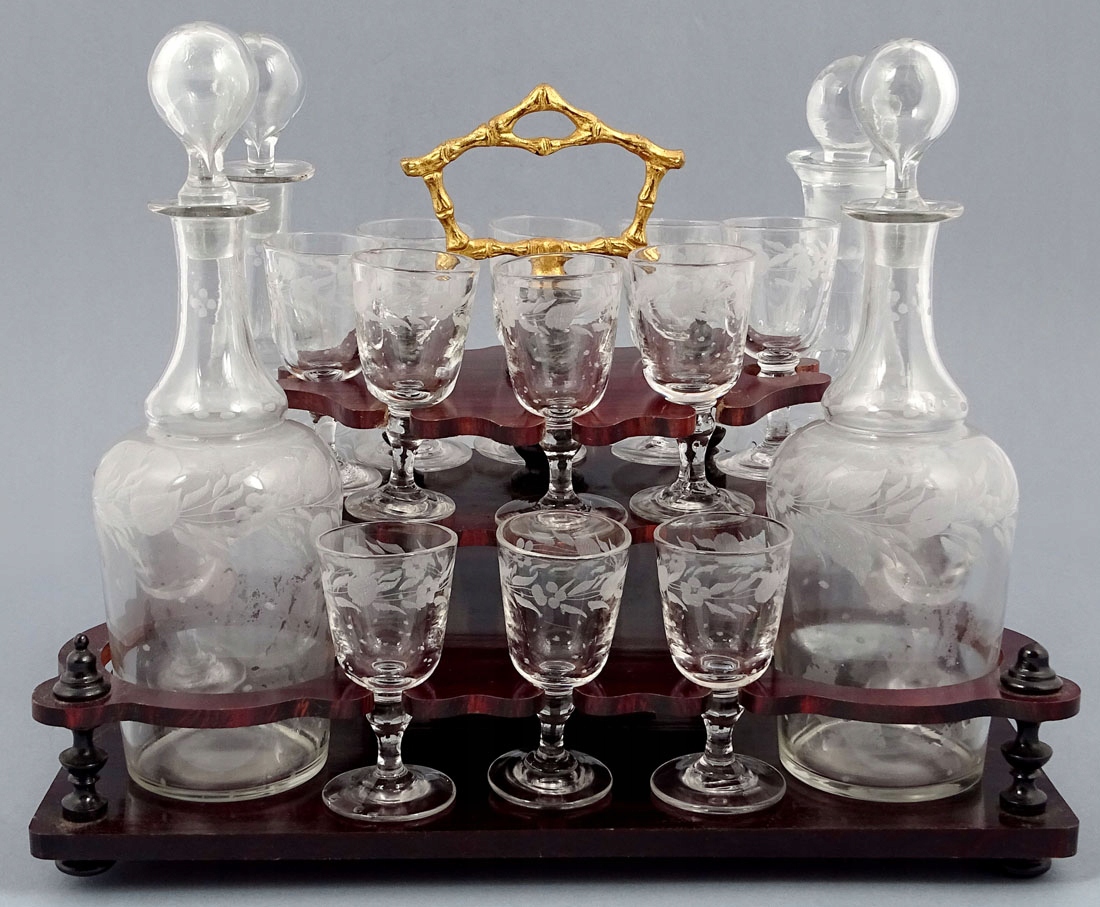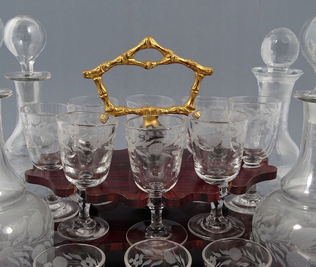 4 графина с тонкими горлышками и закатанным носиком, с пробками. Брюшки украшены вырезом в виде усиков растений. Кроме того, 16 бокалов на тонкой ножке украшены тем же узором, что и графины. Стаканы помещены на деревянную, двухуровневую, съемную оправу, с латунной, гравированной ручкой сверху.