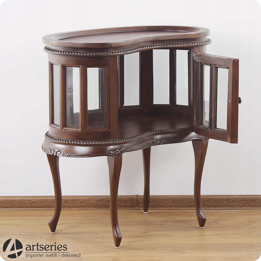 Вы любитель ликеров? У вас есть красивые графины и вы ищете бар, где можно их выставить? Тогда вы не могли бы сделать лучший выбор! Мы будем рады познакомить Вас с нашим предложением! Представляем батончик, корпус которого имеет форму боба. Имеет дверцу, расположенную в вогнутой части. По бокам расположены вертикальные витрины по всей длине, благодаря чему находящиеся внутри предметы будут выглядеть великолепно. Штанга стоит на четырех тонких изогнутых ножках. Кроме того, он оснащен деревянным подносом, который также является самой высокой частью мебели. Бар изготовлен вручную из массива красного дерева. Приданный ей теплый ореховый цвет чудесно подчеркивает тонкую, декоративную резьбу, а главное, прекрасно контрастирует с прозрачным стеклом графинов или других бутылок.