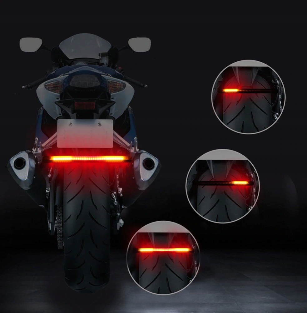 Гибкая светодиодная лента представляет собой решение новейших технологий и предназначена для людей, которые хотят добиться уникального внешнего вида своего мотоцикла. Полоса имеет функции поворотников, габаритных огней и стоп-сигналов.