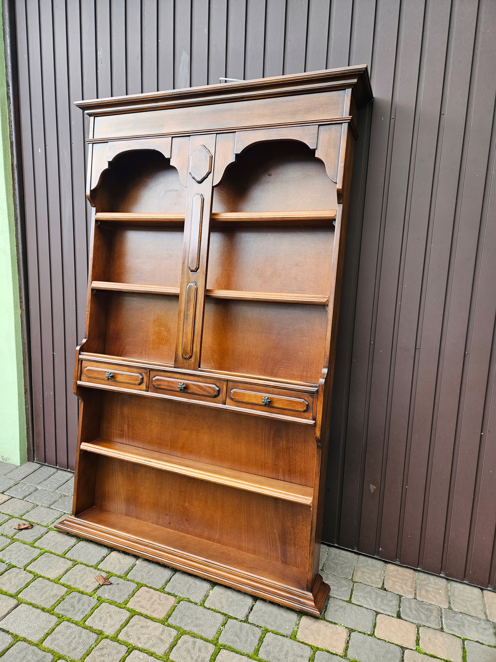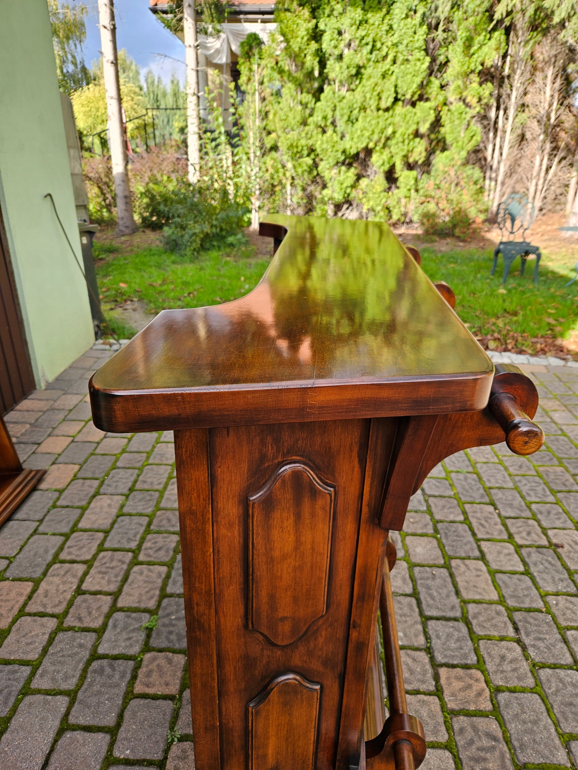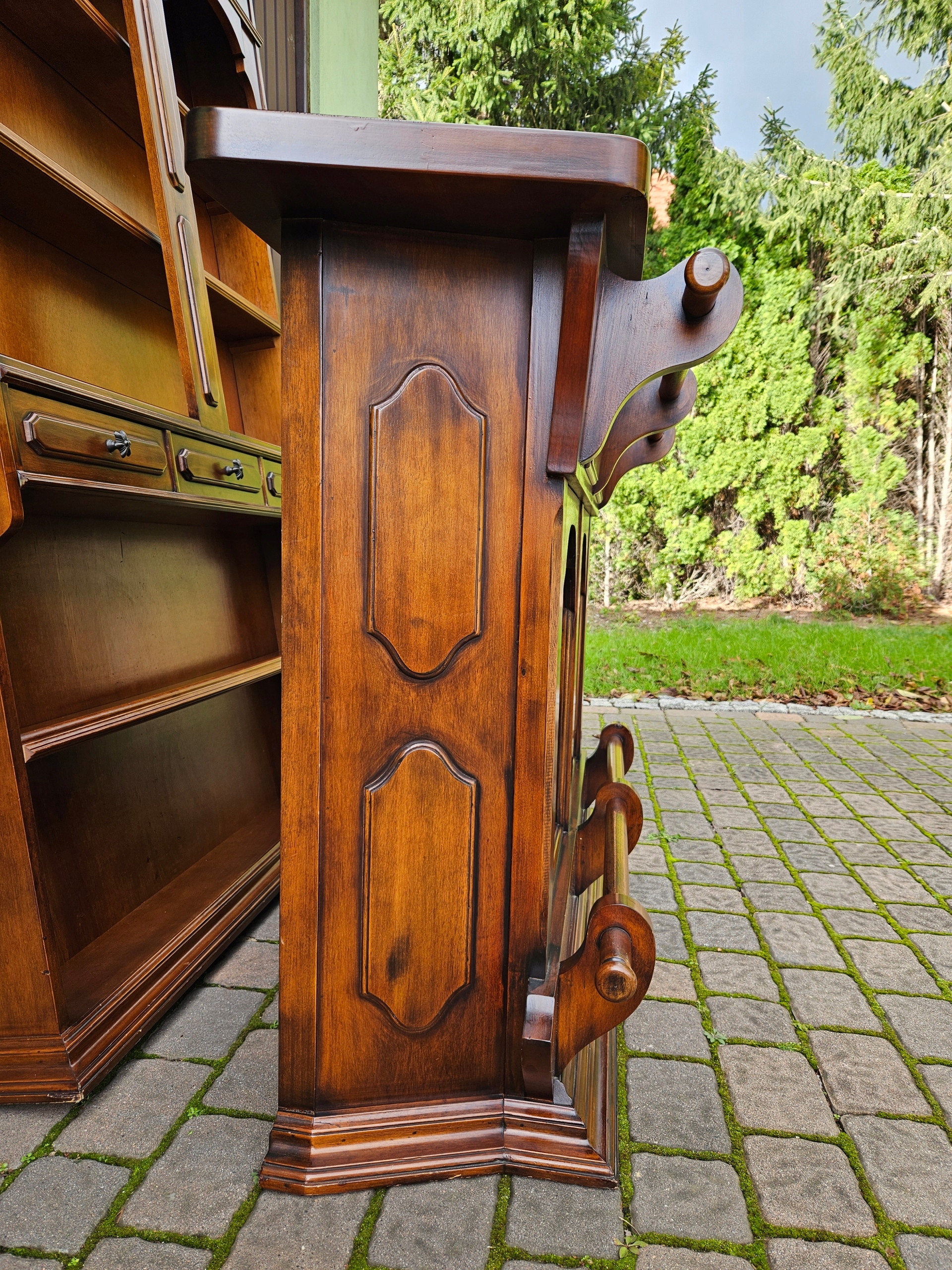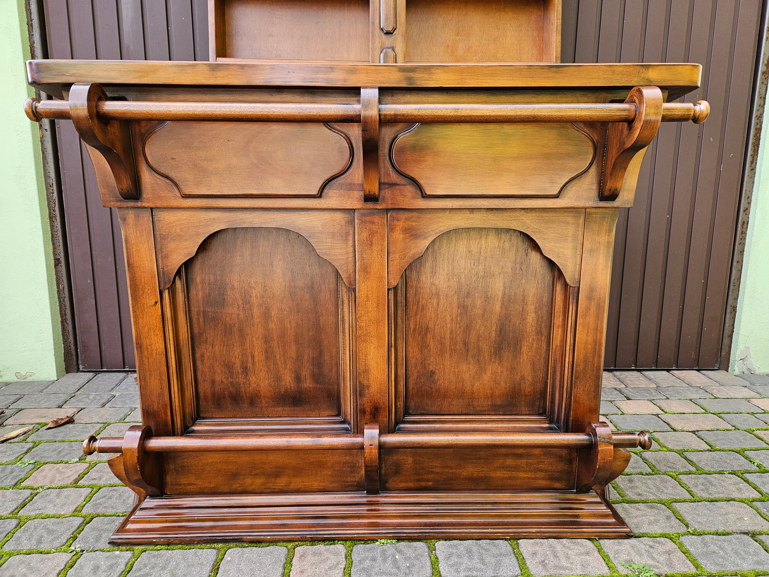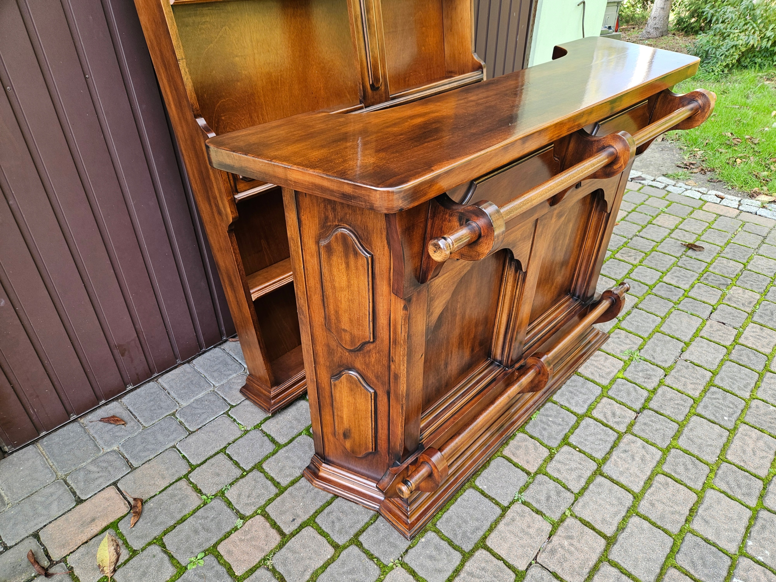 Стильный деревянный бар с полкой и большим удобным буфетом. Предмет мебели выполнен добротно, в теплом коричневом оттенке. В целом создается функциональный и декоративный комплект мебели, который может стать привлекательным элементом оборудования гостиной или столовой.