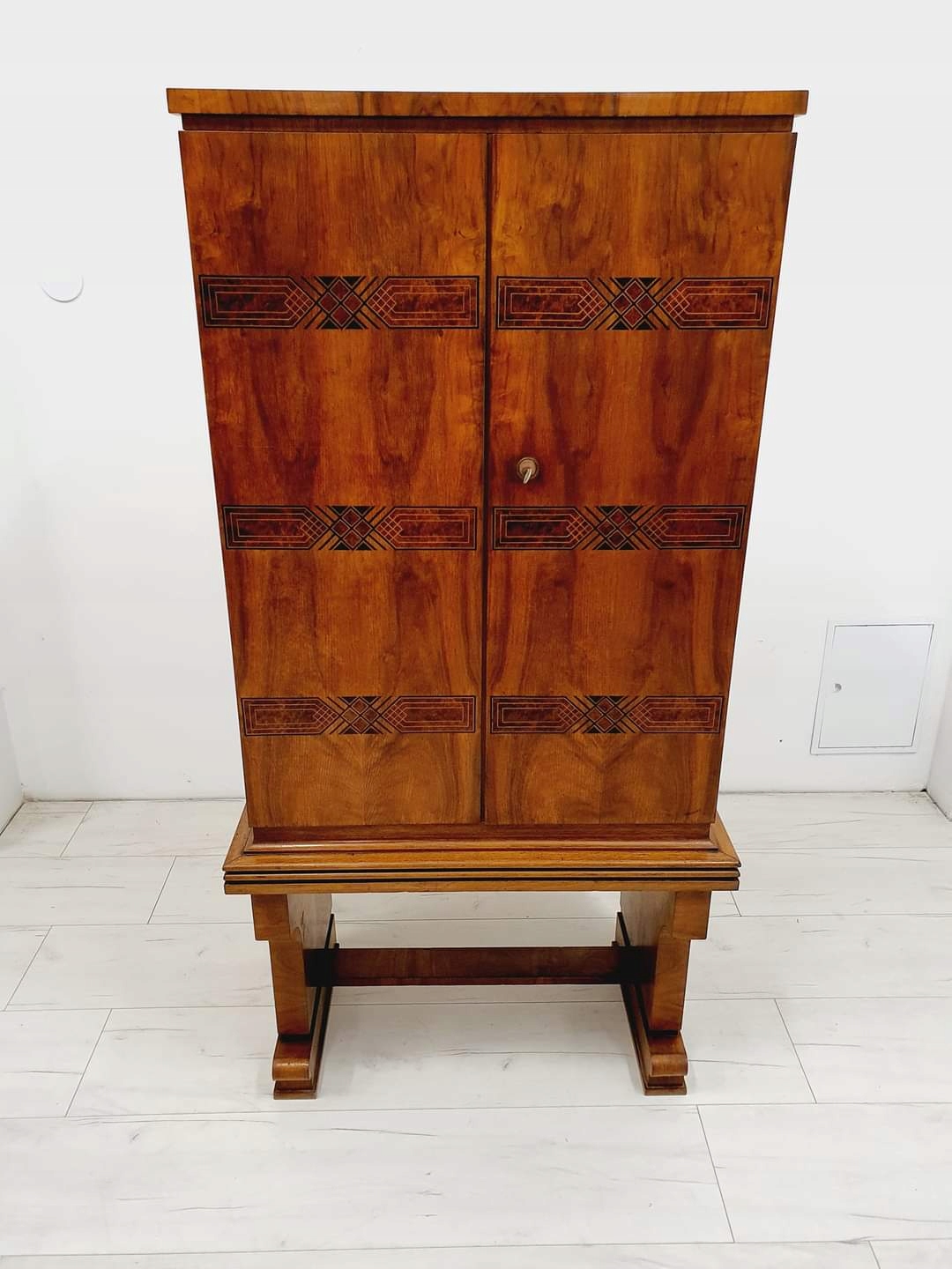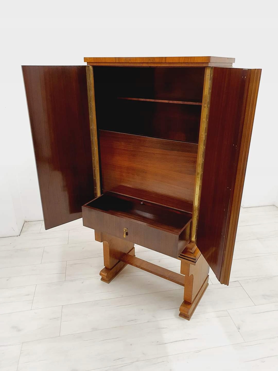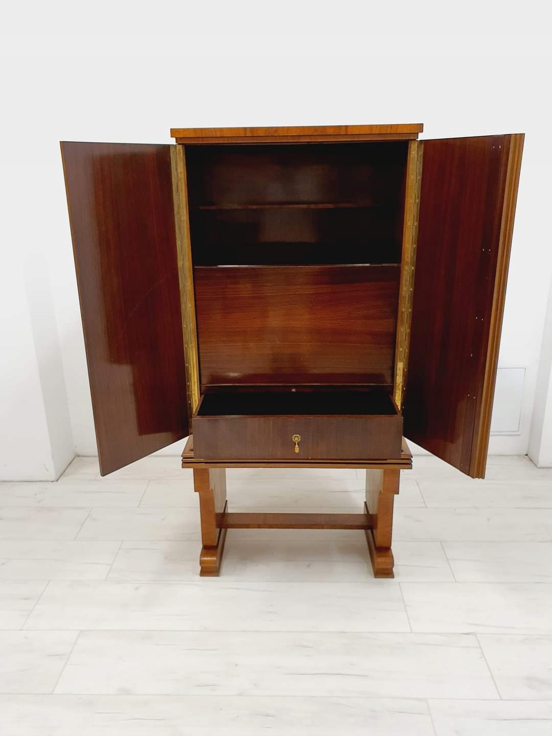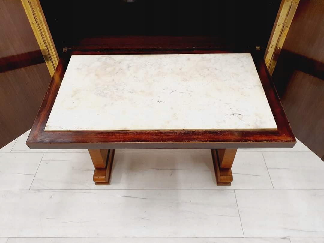 Бар/бар в стиле ар-деко, Чехословакия, 1930-е годы. Очень интересная форма в виде шкафа. Внутренняя часть облицована палисандром, на складной створке установлена каменная столешница. Подпись на ключе (к сожалению, пока не удалось определить дизайнера).