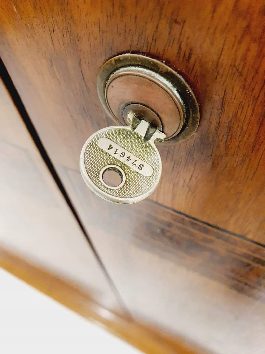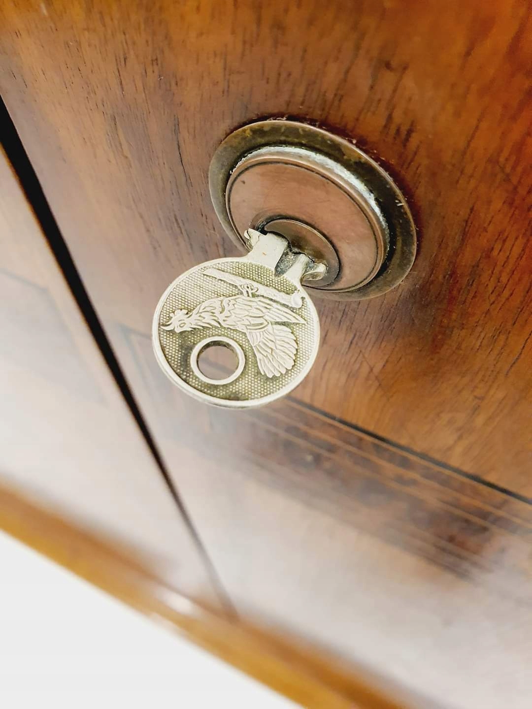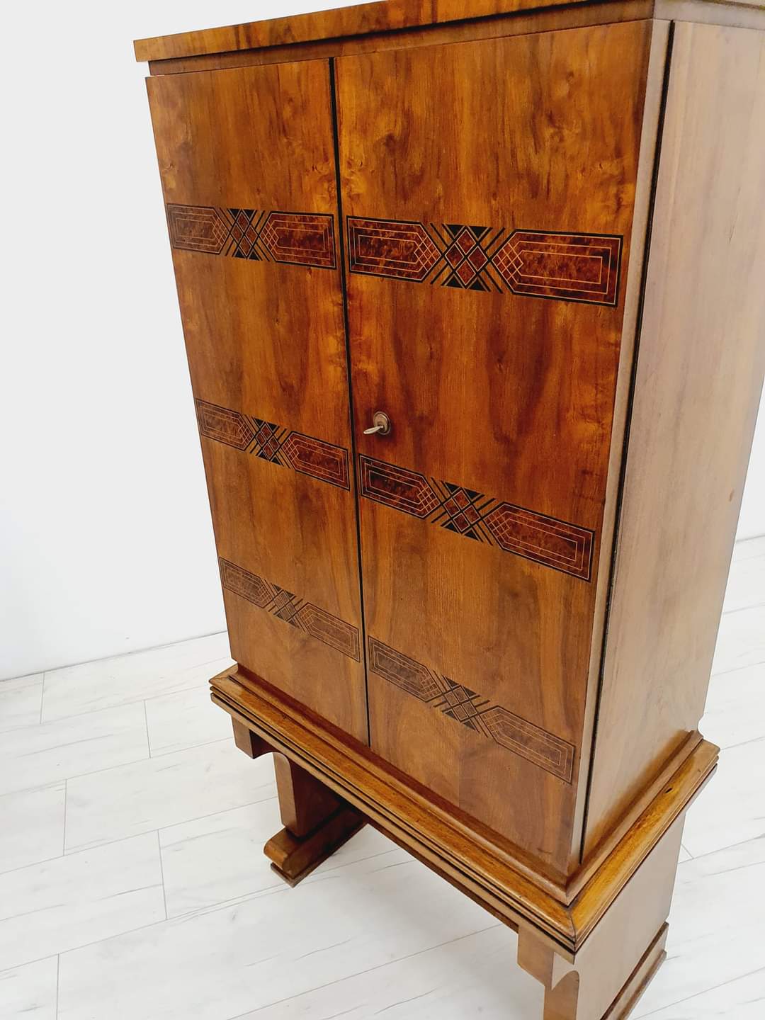 Бар/бар в стиле ар-деко, Чехословакия, 1930-е годы. Очень интересная форма в виде шкафа. Внутренняя часть облицована палисандром, на складной створке установлена каменная столешница. Подпись на ключе (к сожалению, пока не удалось определить дизайнера).
