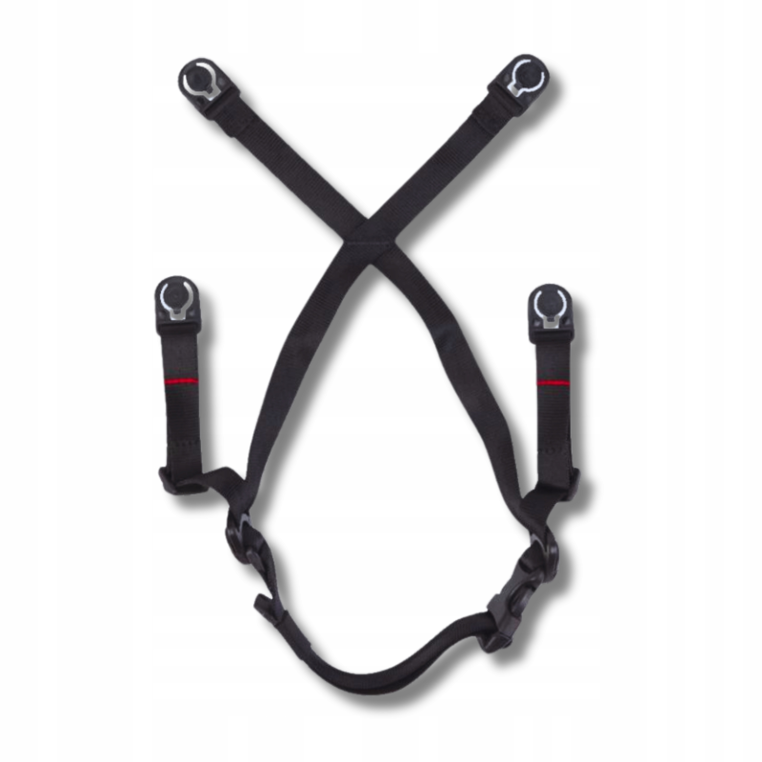 - Два ремня для подбородка, которые можно легко заменить и отрегулировать в соответствии с условиями работы. Подбородочный ремень EN397 для использования на земле имеет цветовую маркировку черного и серого цветов. Подбородочный ремень, соответствующий стандарту EN12492 для работы на высоте, отмечен черным и красным цветом.
