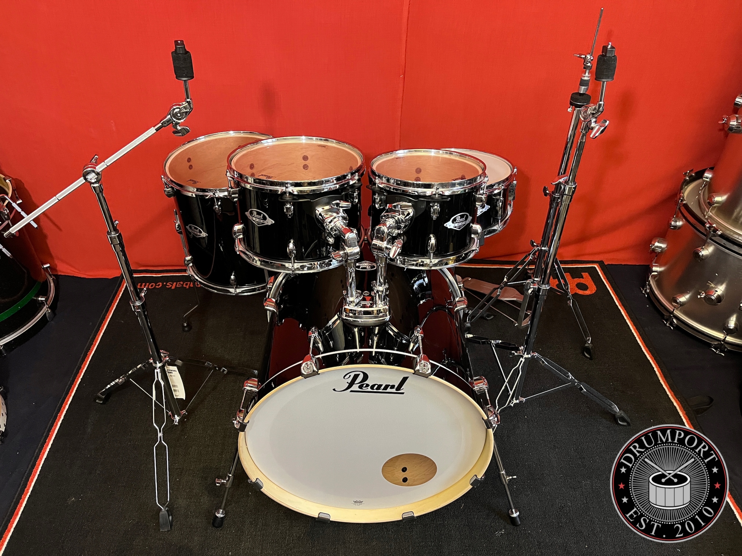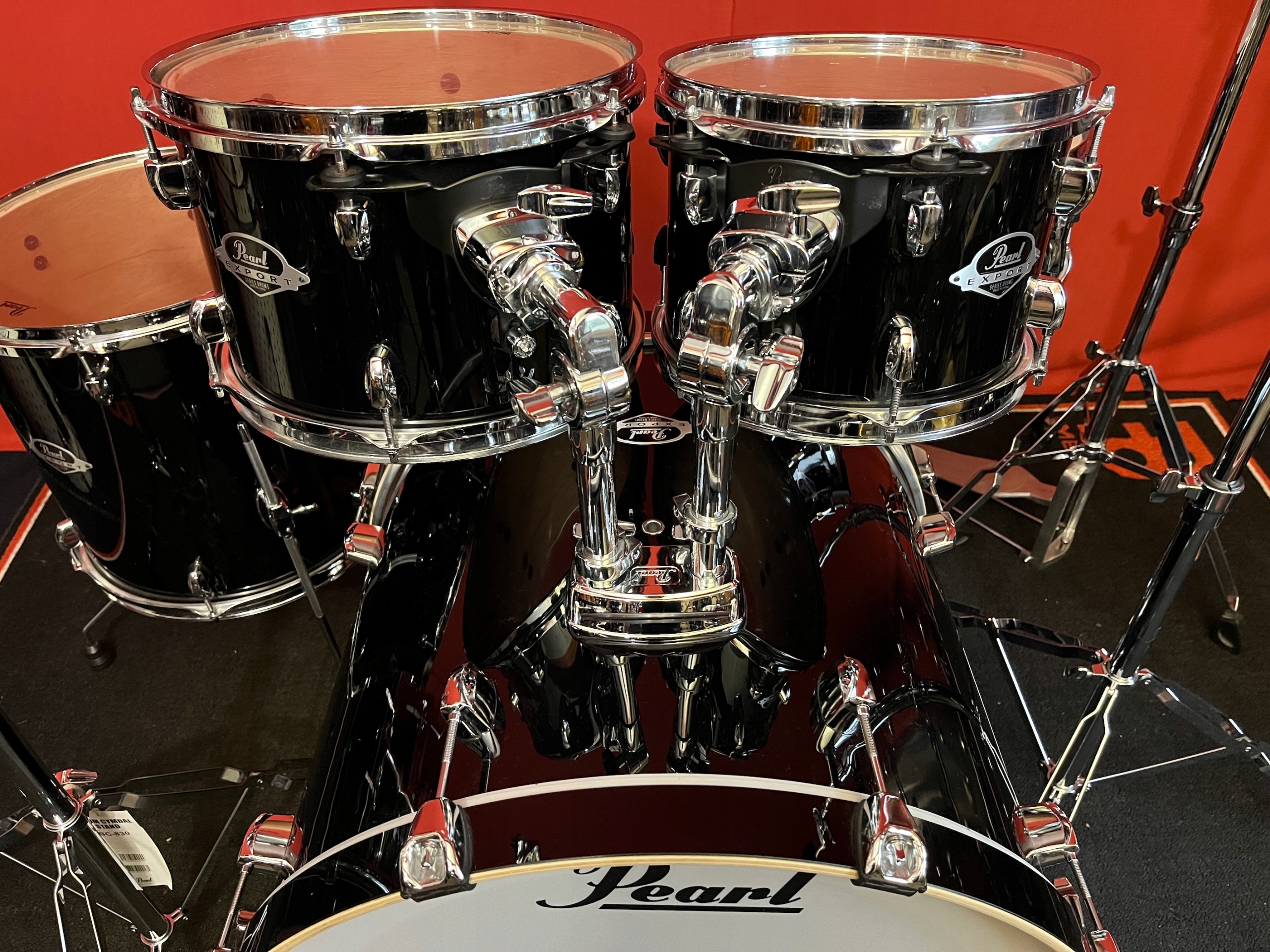 Последняя серия «Export». Комплект в очень хорошем состоянии, имеет следы нормального использования. Как барабаны, так и фурнитура не имеют скрытых дефектов. Барабаны продаются с полным, прочным и оригинальным оборудованием серии 830. Корпуса барабанов изготовлены, как и у классического Экспорта, из гибрида тополя и красного дерева по технологии SST. Томы оснащены новой подвеской Opti Loc, прикрепленной к двум выступам и вентиляционному отверстию, что обеспечивает оптимальный резонанс и сустейн барабанов, сохраняя при этом стабильность настройки. Небольшие выступы с небольшой площадью контакта с корпусом и небольшой вес также помогают добиться такого эффекта. В комплект входит деревянный малый барабан соответствующего дизайна.