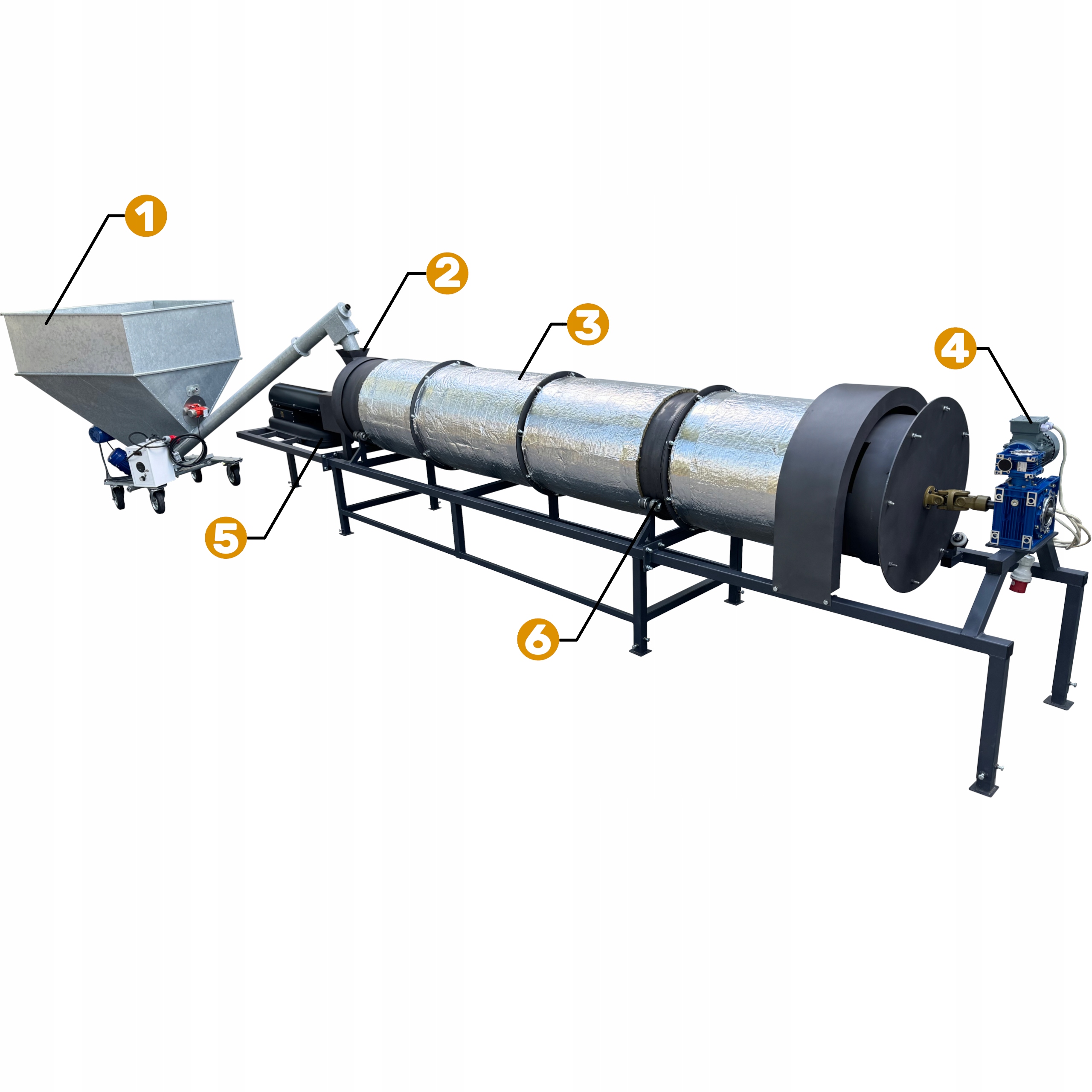 3️⃣) Барабан: Здесь происходит правильная сушка материала. На внутренних стенках имеются лопасти, отвечающие за непрерывное перемешивание материала, благодаря чему потеря нежелательной влаги из материала происходит быстрее. Барабан дополнительно изолирован для предотвращения потерь тепла.