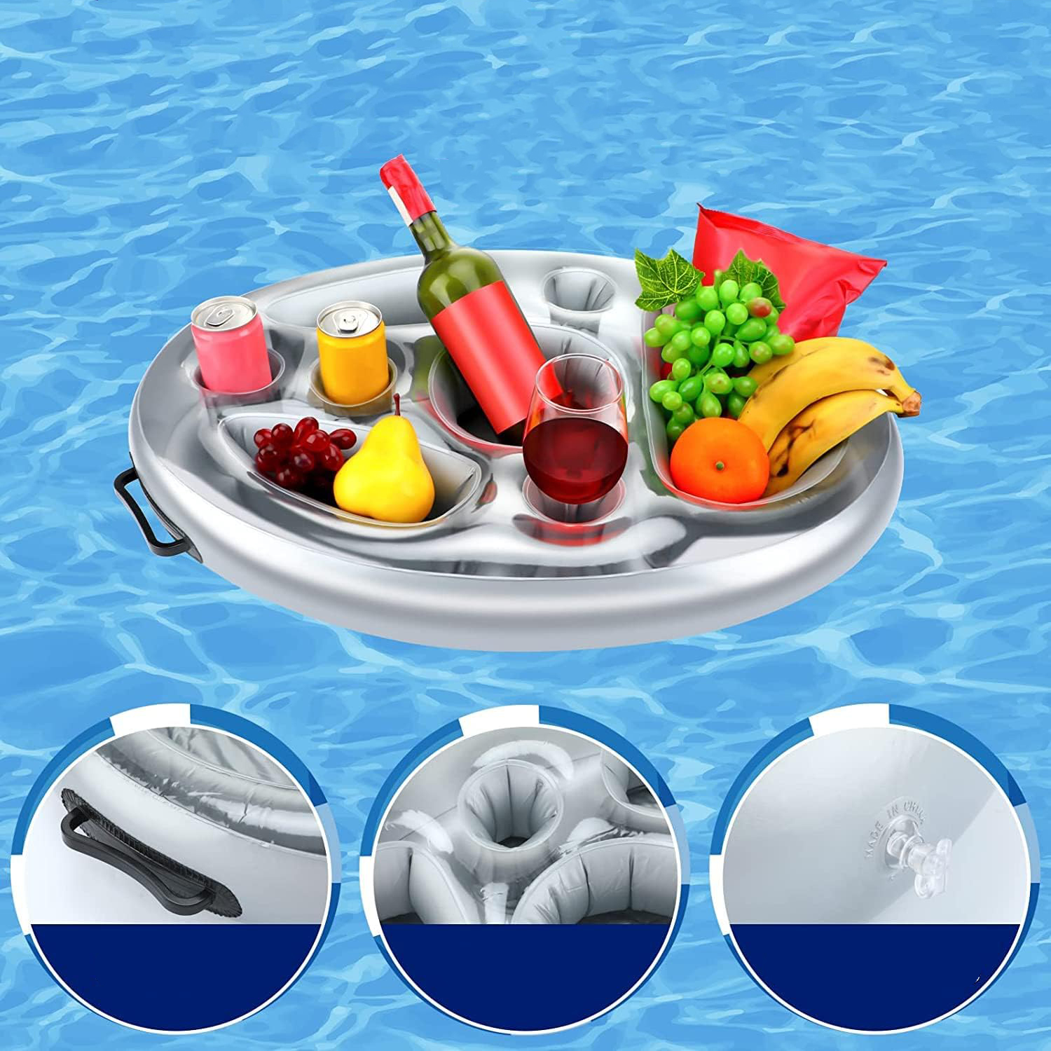 ✔ 【Большая вместимость】: У держателя плавающего напитка есть 8 лунок для хранения пива, шампанского, закусок, фруктов, мобильного телефона, музыкального игрока и т. Д.