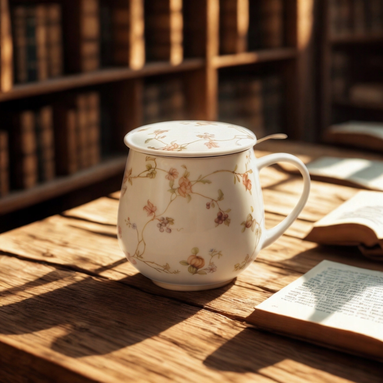 - Элегантная, фарфоровая кружка ствола, украшенная мотивом окрашенных цветов в пастельных тонах розового и фиолетового цвета, с деликатными лепестками и почками