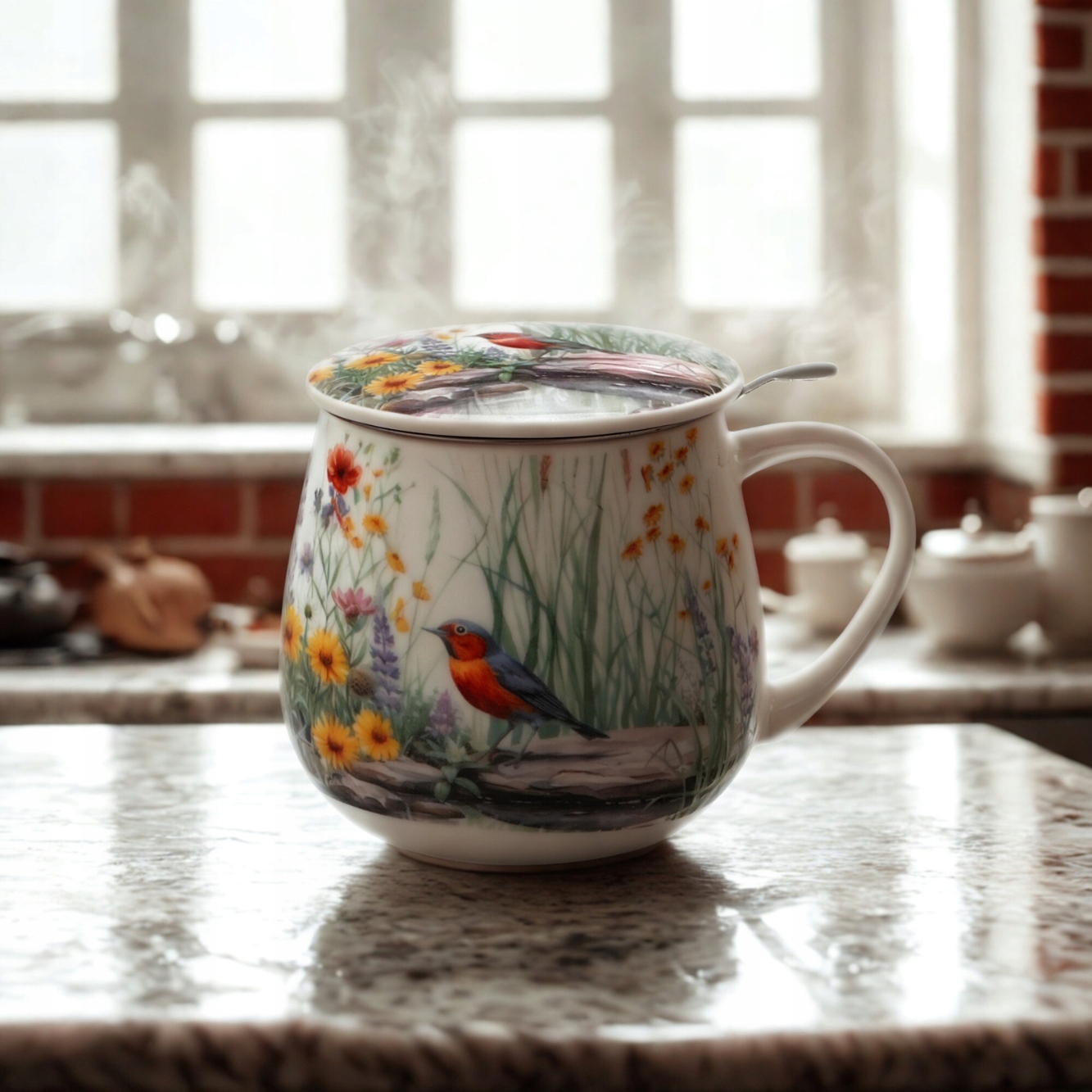 - Элегантные, фарфоровые стержни, украшенные мотивом маленькой птицы, стоящей на гальке в пруду, окруженной пышными прибрежными растениями и красочными цветами