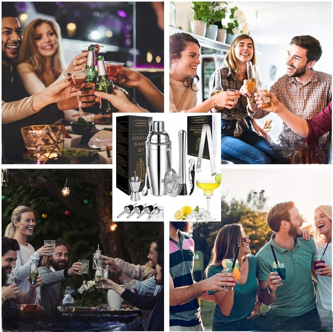Если вы хотите продемонстрировать своим друзьям простые и впечатляющие навыки, вы не можете пропустить наш набор для смешивания коктейлей. Пришло время для коктейльной вечеринки. Маргарита, Манхэттен, Старомодный, Сухой Мартини, Текила Санрайз или Лонг-Айлендский чай со льдом ждут вас. Набор для приготовления коктейлей LIVEHITOP содержит все необходимые аксессуары для приготовления коктейлей. Шейкер из нержавеющей стали емкостью 750 мл (26 унций), 3 насадки для бутылок, 1 ситечко для льда, 1 штопор, 1 барменская ложка, 1 мерный стакан емкостью 15/30 мл, 1 пестик для мохито, 1 щипцы для льда,