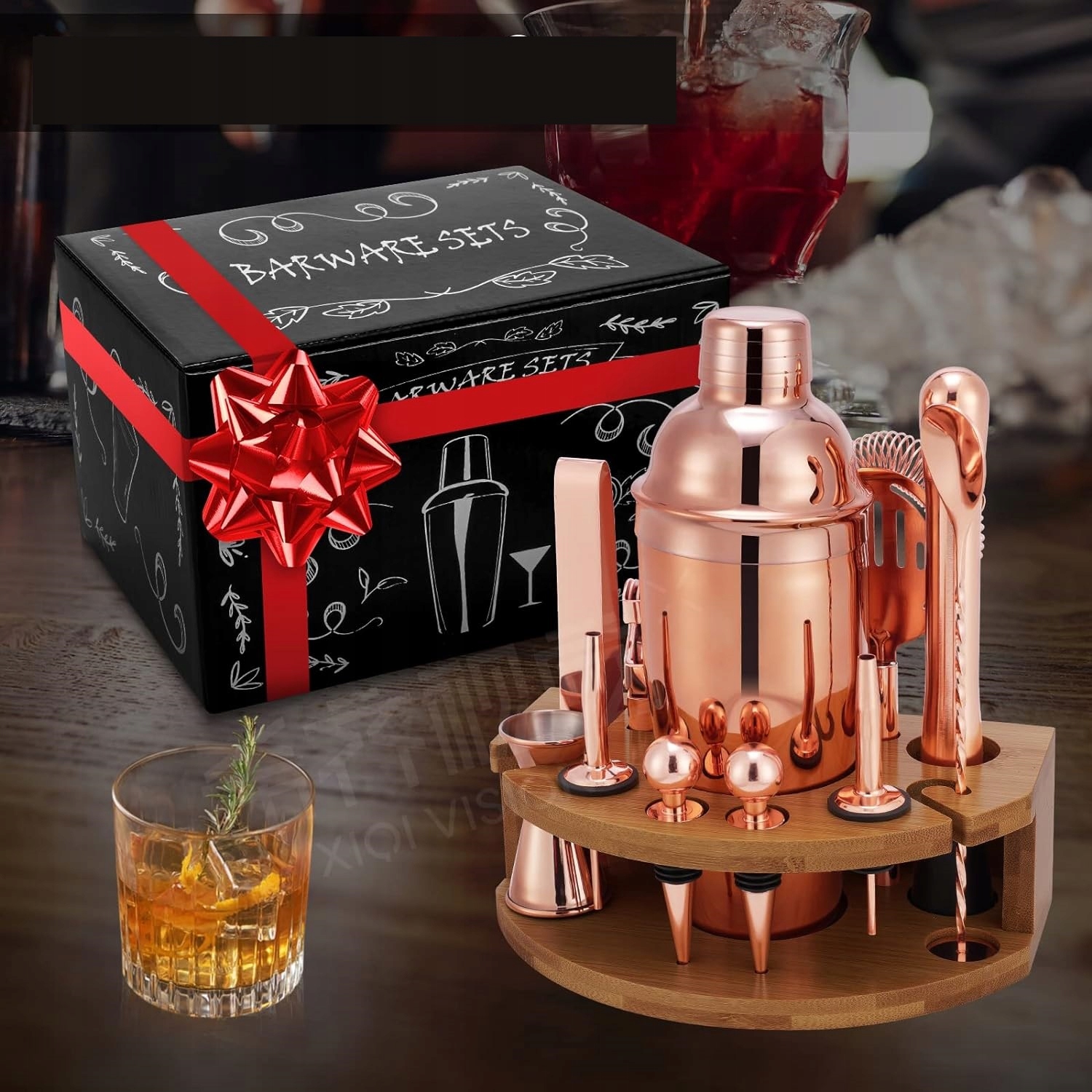 - Удобный набор для бармена. Наш набор шейкеров содержит все необходимые барменские инструменты. В комплект из 12 предметов входят: шейкер для коктейлей на 25 унций, ситечко, толкушка, ложка, мерный стакан на 1/2 унции, щипцы для льда, штопор, 2 насадки для спирта, 2 пробки для вина, красивая бамбуковая подставка и рецепт коктейля.