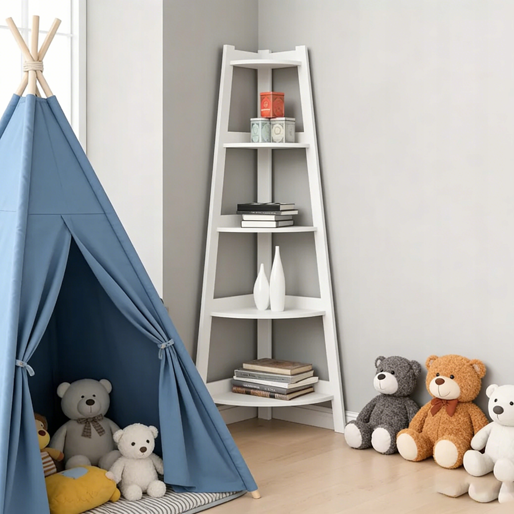 Удобный для угловой дизайн: треугольная основная конструкция в сочетании с веерообразными полками идеально вписывается в прямоугольные углы вашего дома. Это позволяет максимально эффективно использовать угловое пространство, которое в противном случае осталось бы неиспользованным, не занимая при этом площадь пола и не нарушая общую планировку комнаты. Легко адаптируется к компактным квартирам, небольшим домам или углам любой комнаты, оптимизируя использование пространства.