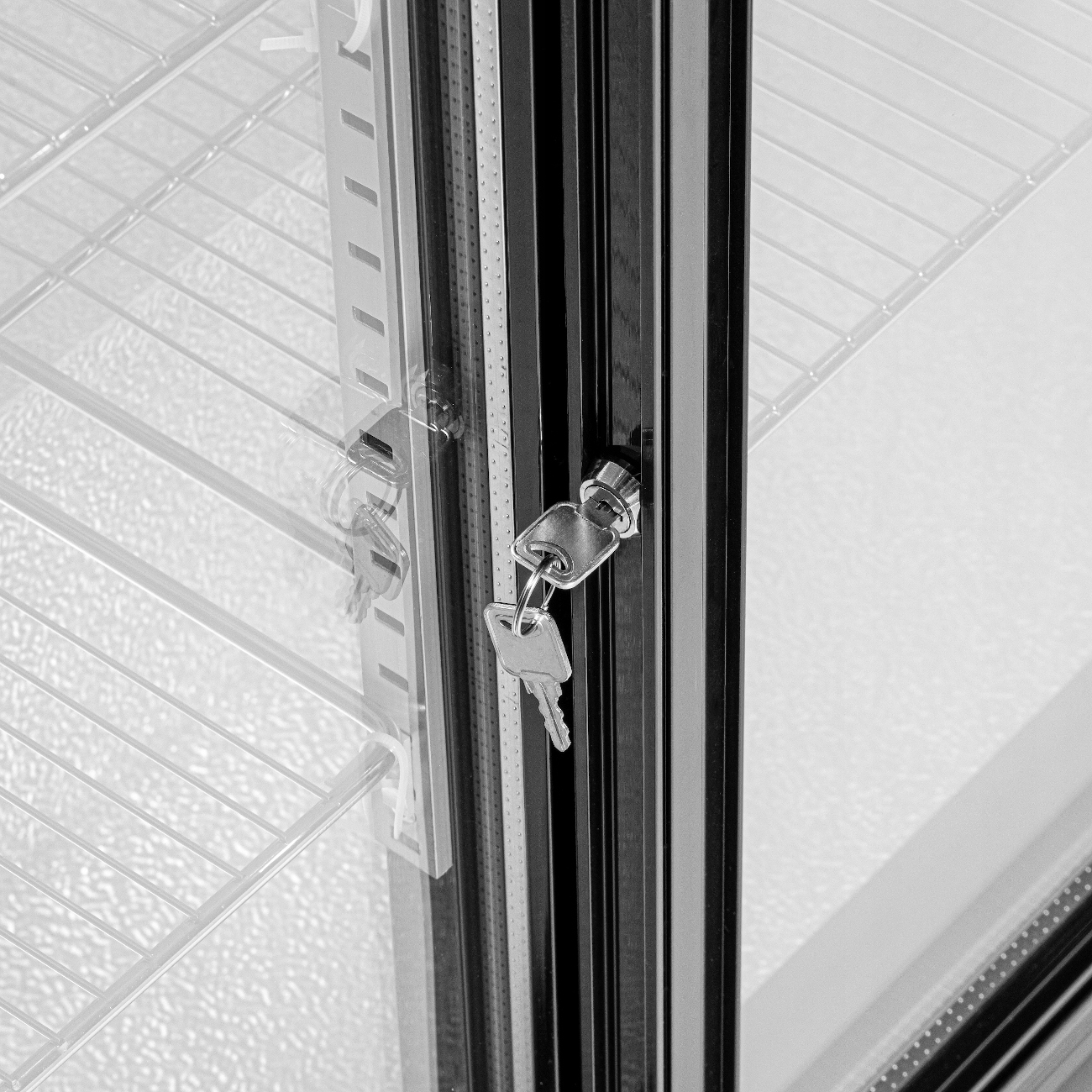 Модель FG07703 оснащена тремя раздвижными дверцами с двойным стеклом, наружным закаленным, что обеспечивает высокую прочность и отличную теплоизоляцию. Встроенный замок дополнительно защищает хранящиеся напитки, что особенно важно в местах с интенсивным движением транспорта.