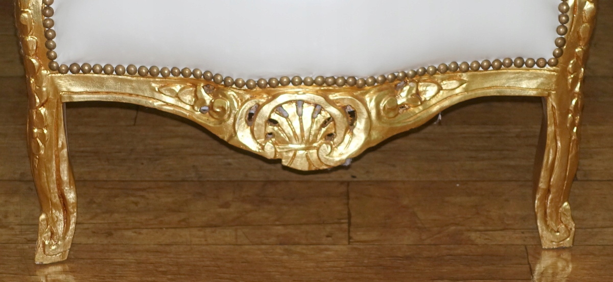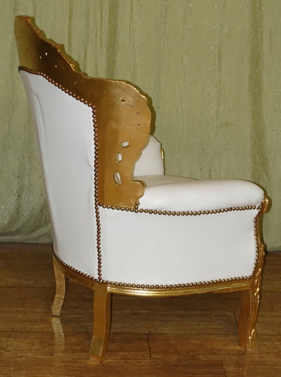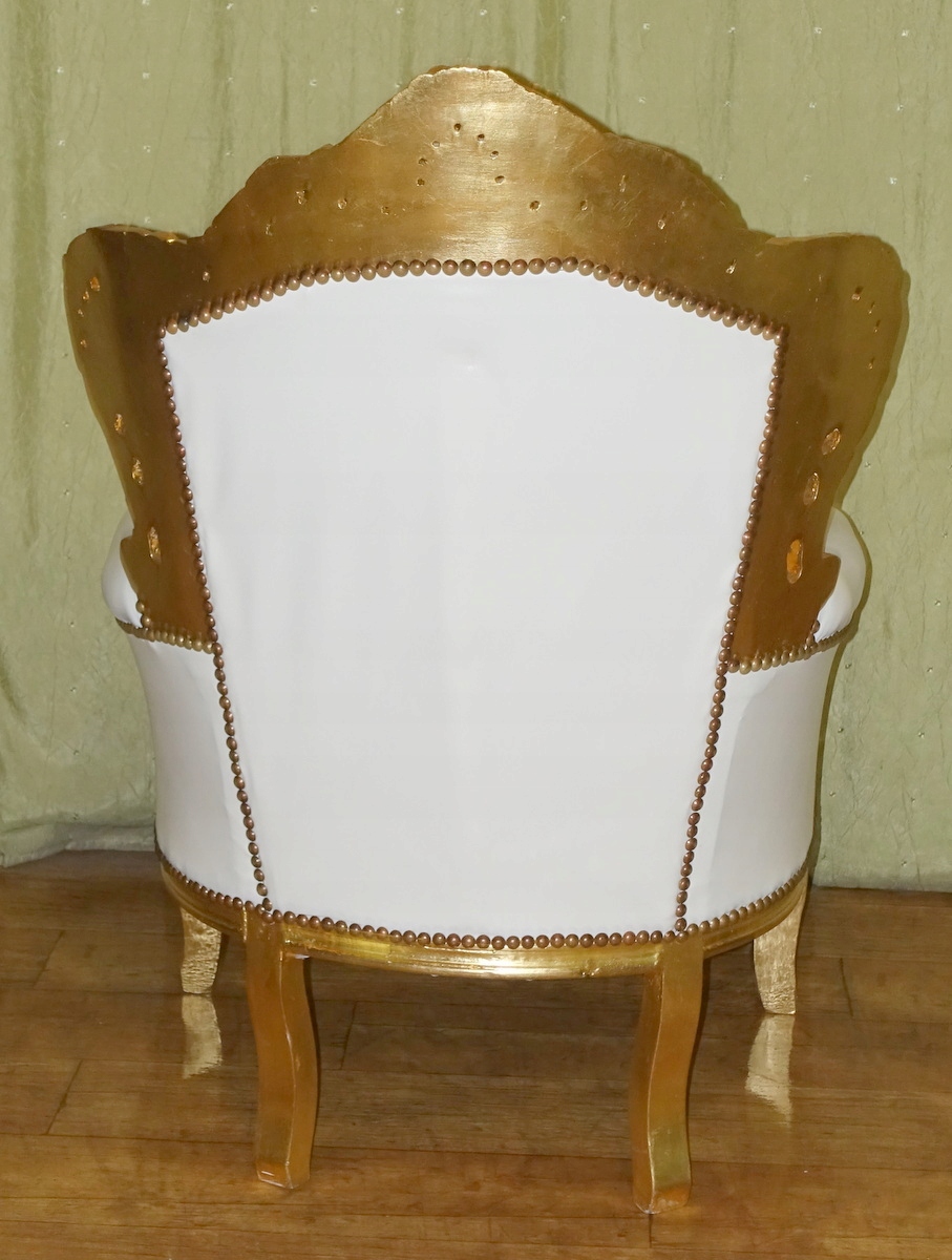 Кресло барокко, деревянная конструкция, как и подобает этому стилю, богато украшена резьбой по золоту. Обивка из экологической кожи старинного белого цвета; спинка со вкусом простегана, и все это эстетично отделано латунной булавкой.