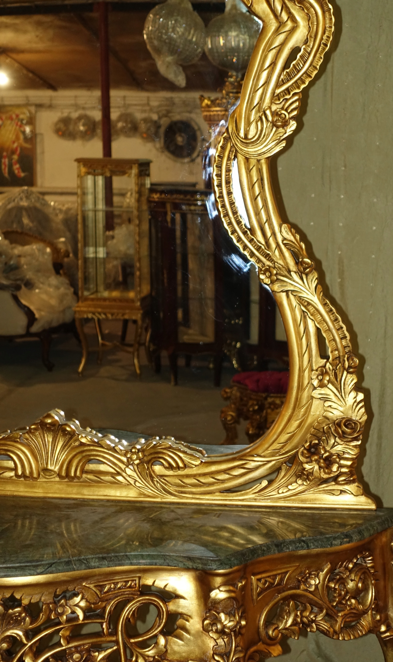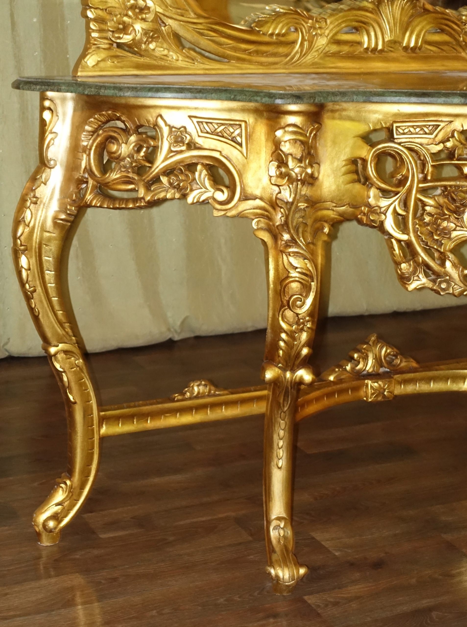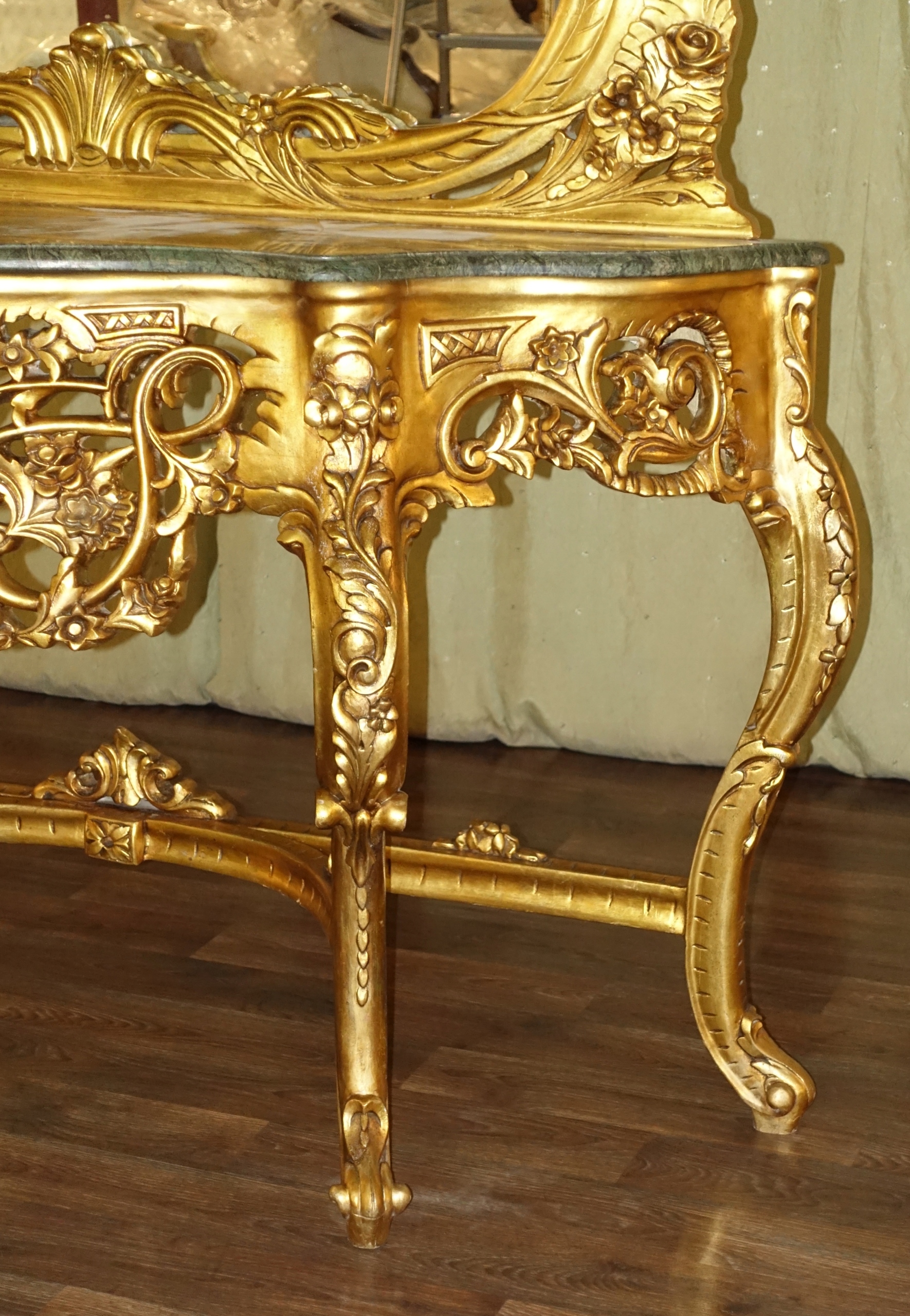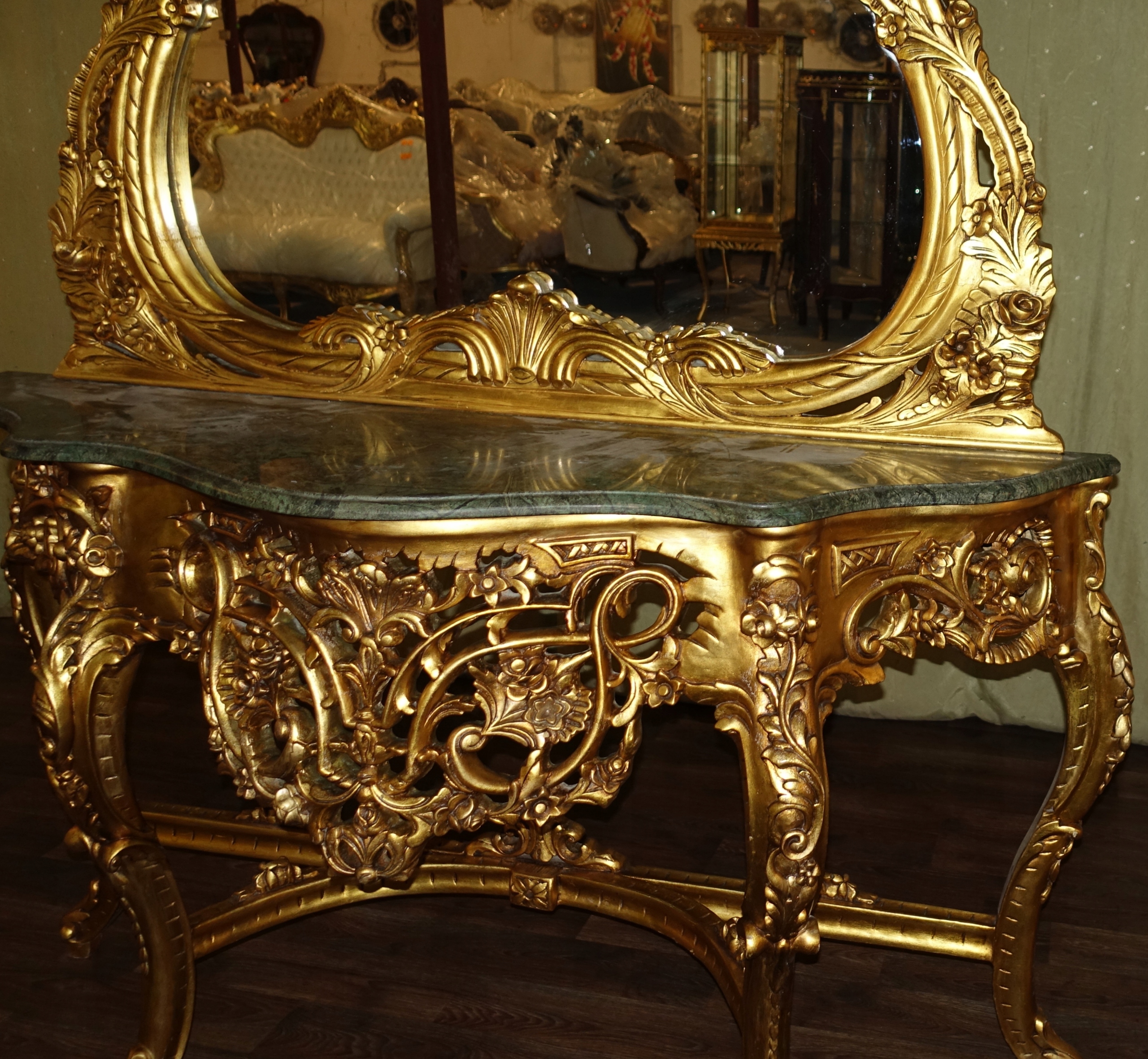 Барокко золотая стильная историческая консоль с зеркалом топ -зеленый мрамор