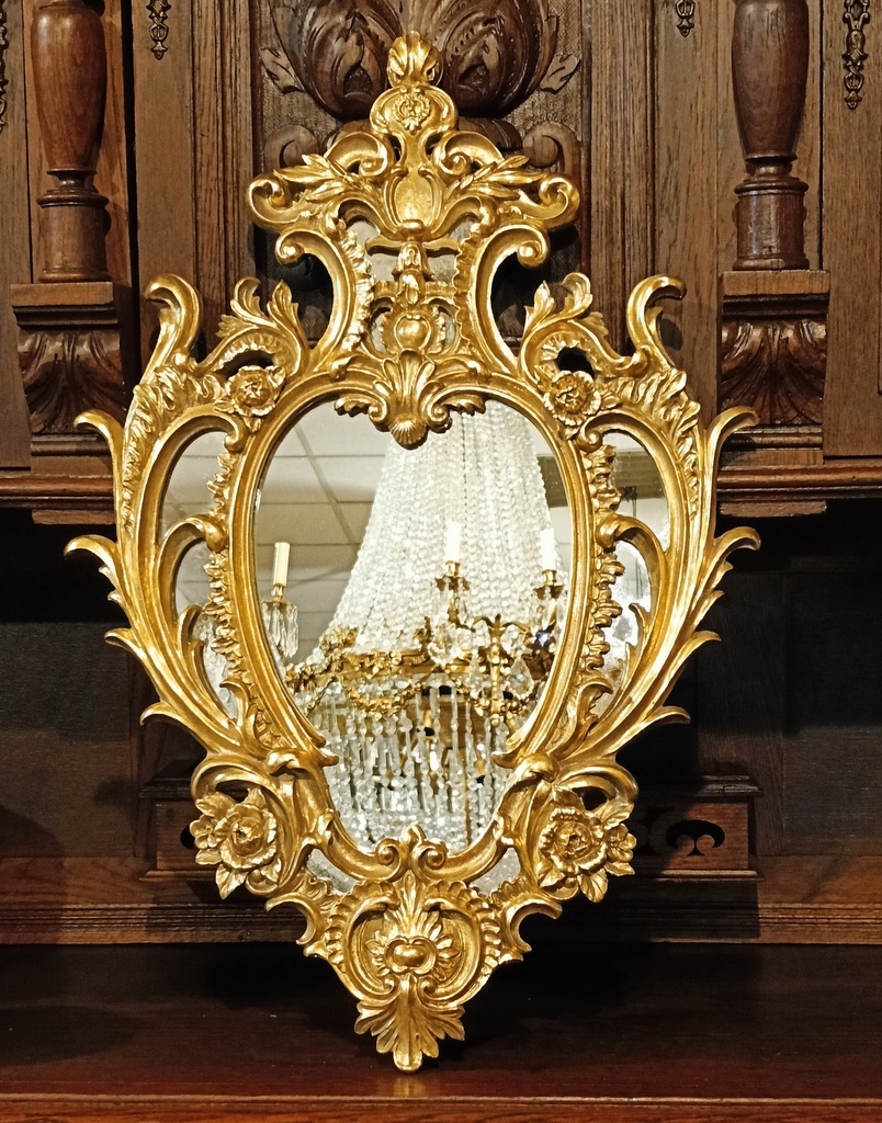 Красивое, впечатляющее зеркало с фантастическим ажурным декором, в теплой золотой раме.