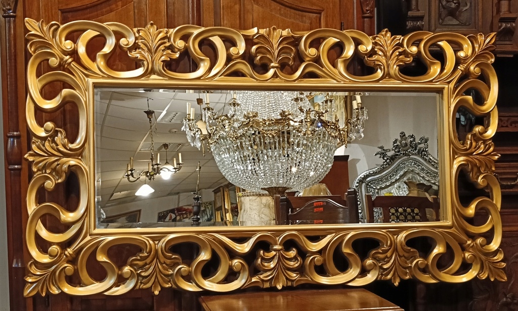 Красивое, эффектное зеркало с фантастическим ажурным декором по всей поверхности рамы теплого золотого цвета.