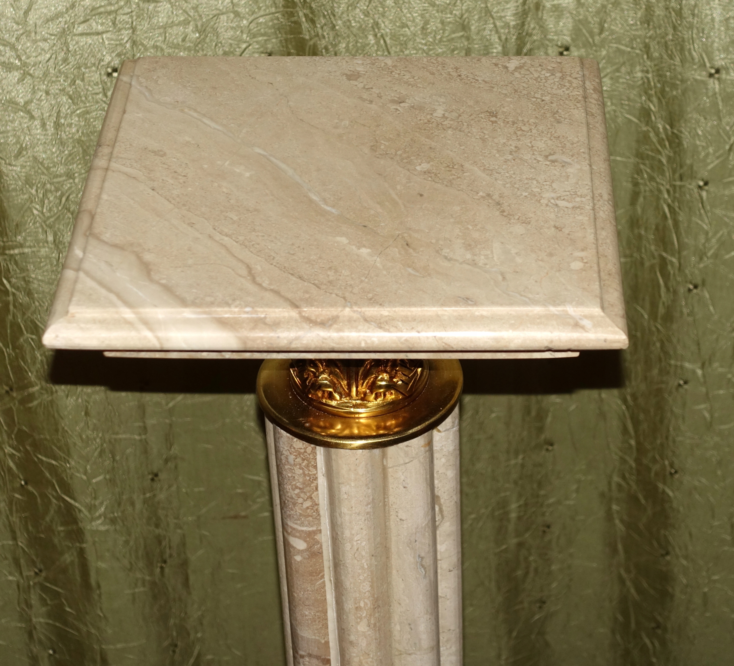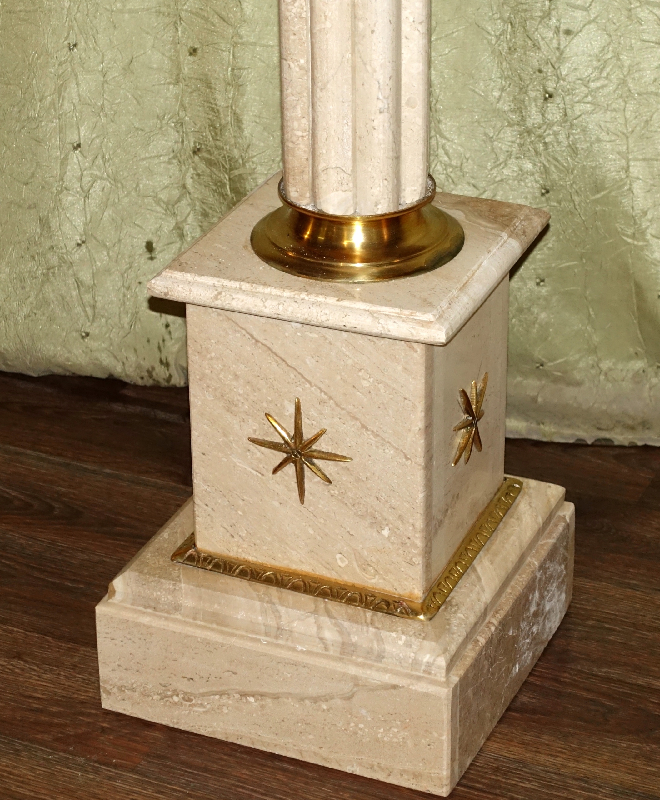 таблица в форме колонны h1> из мрамора в бежевом оттенке с натуральными венами и обесцвечиванием, дополнительно украшенным латунными элементами. Это выглядит очень честно и, безусловно, будет отличным практическим украшением в стильном интерьере, или как стиль разрыва в современном. h1> Я очень рекомендую h1>