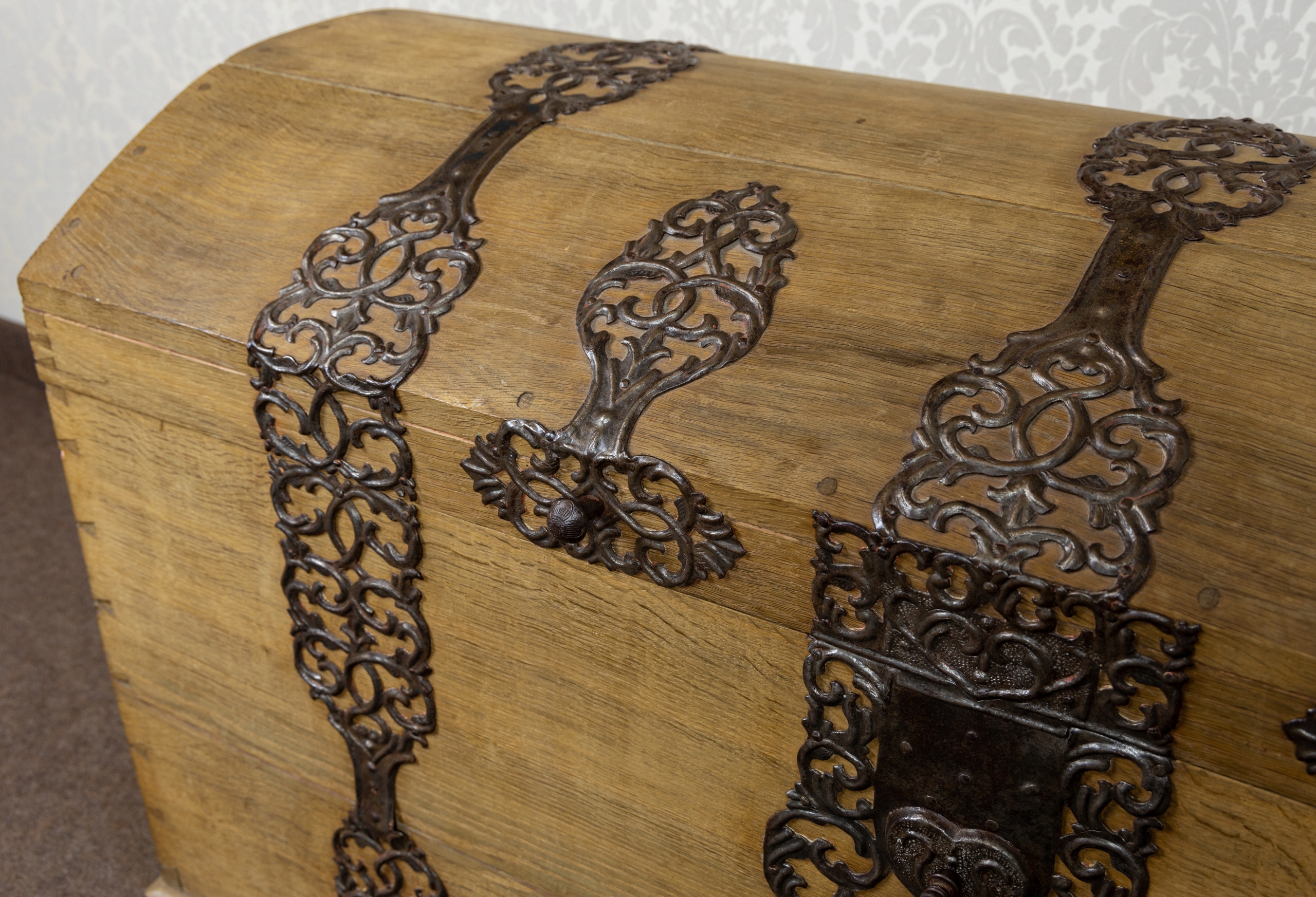 Сундук изготовлен из дубовой массы и украшен фурнитурой ручной работы. Все деревянные элементы закреплены дюбелями, а для крепления фурнитуры использовались гвозди ручной ковки.