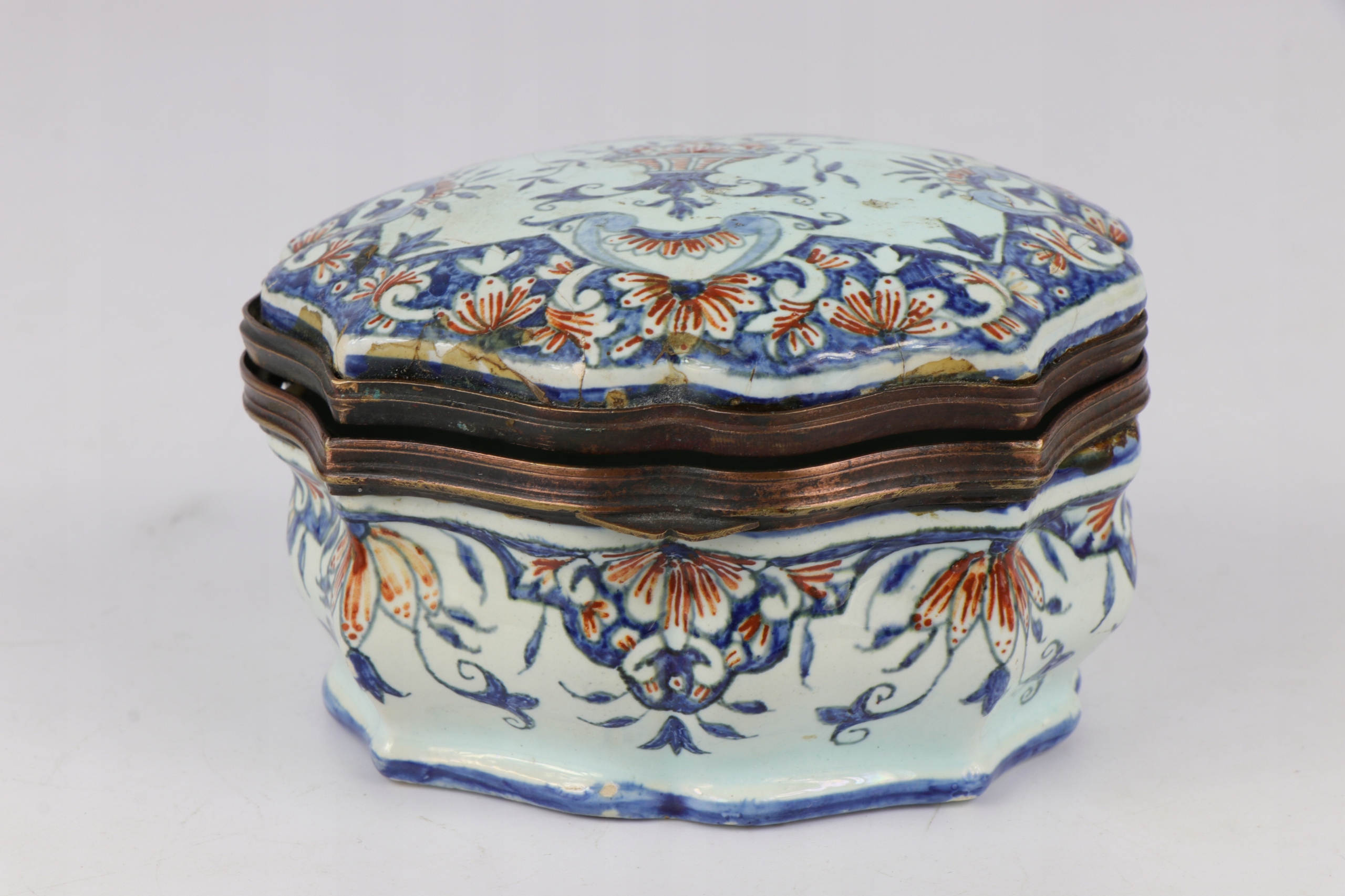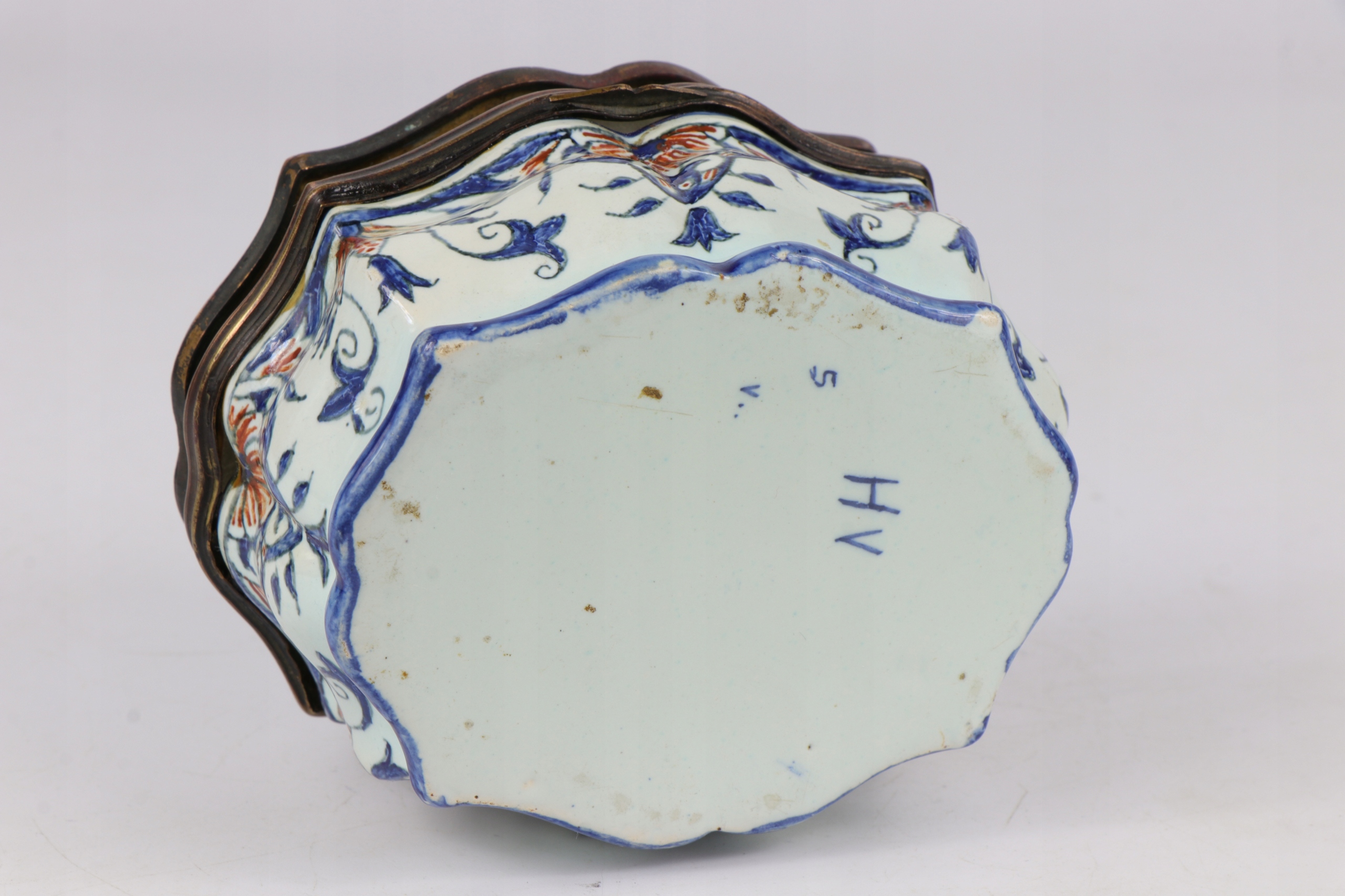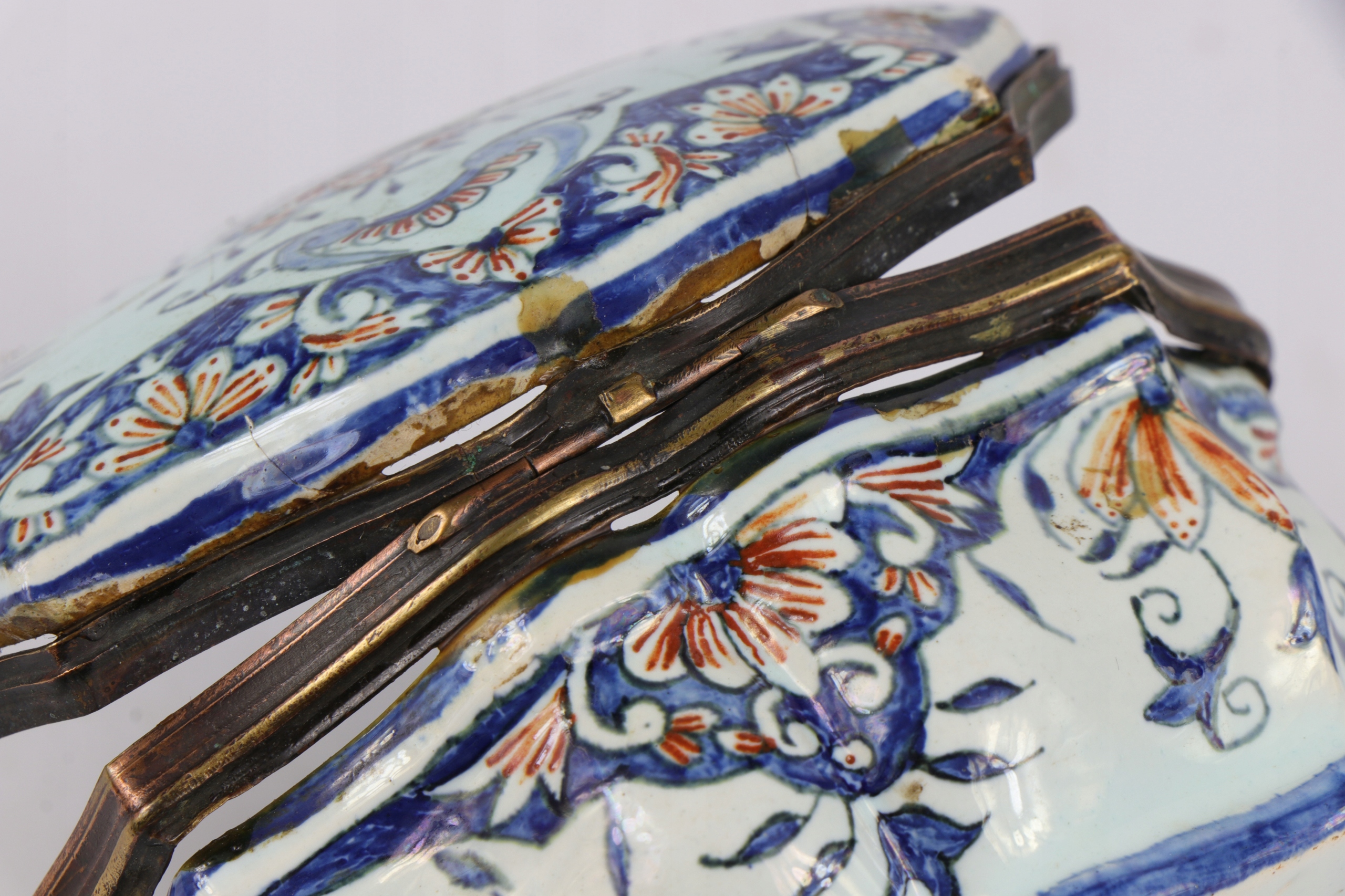 -пленка и подписанный контейнер керамической шкатулки в стиле рококо продуктов руан. Ручная шкатулка, окрашенная в очень богатое украшение. Крышка и коробка в медной подгонке.