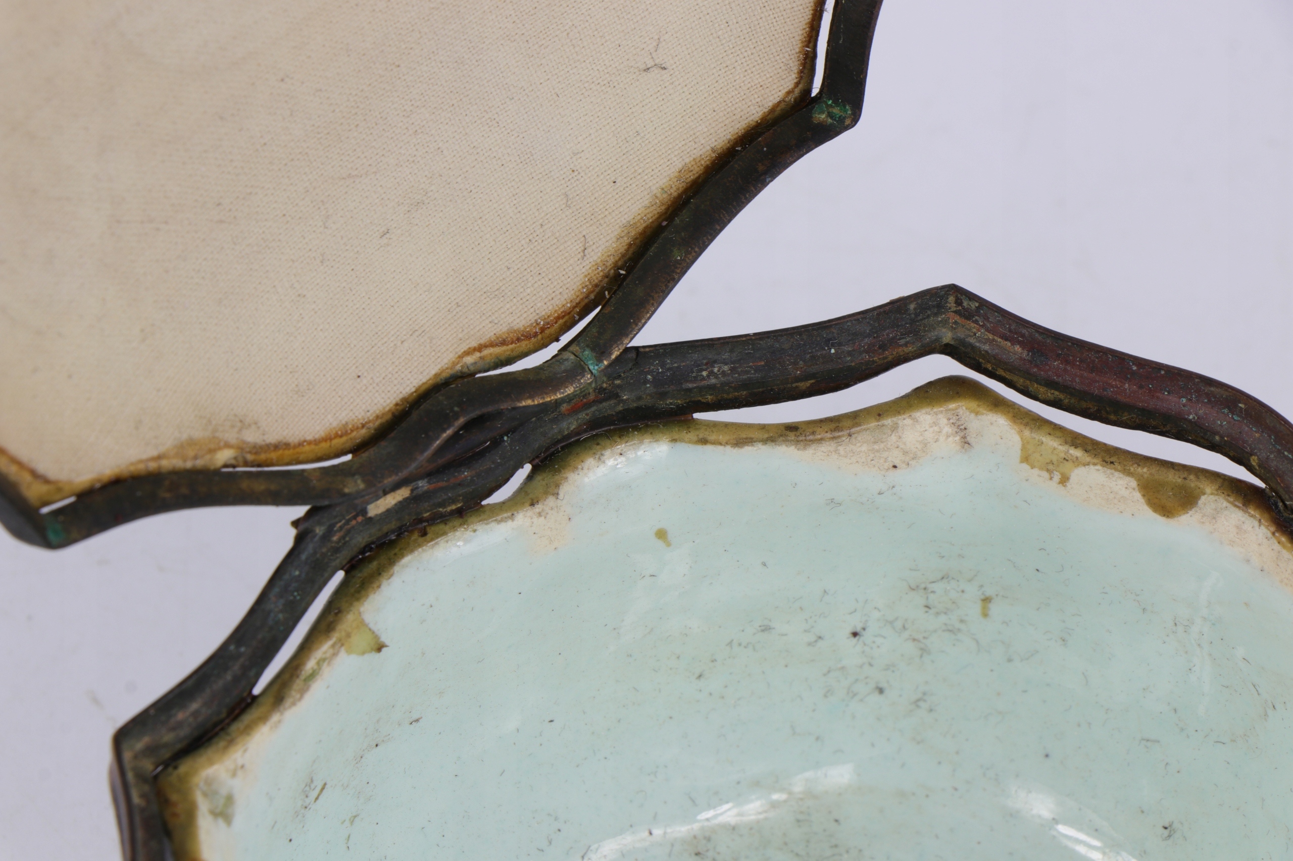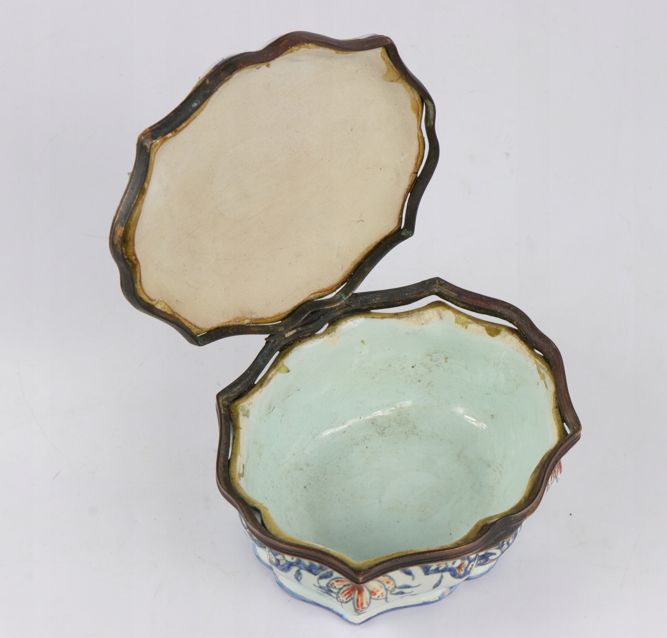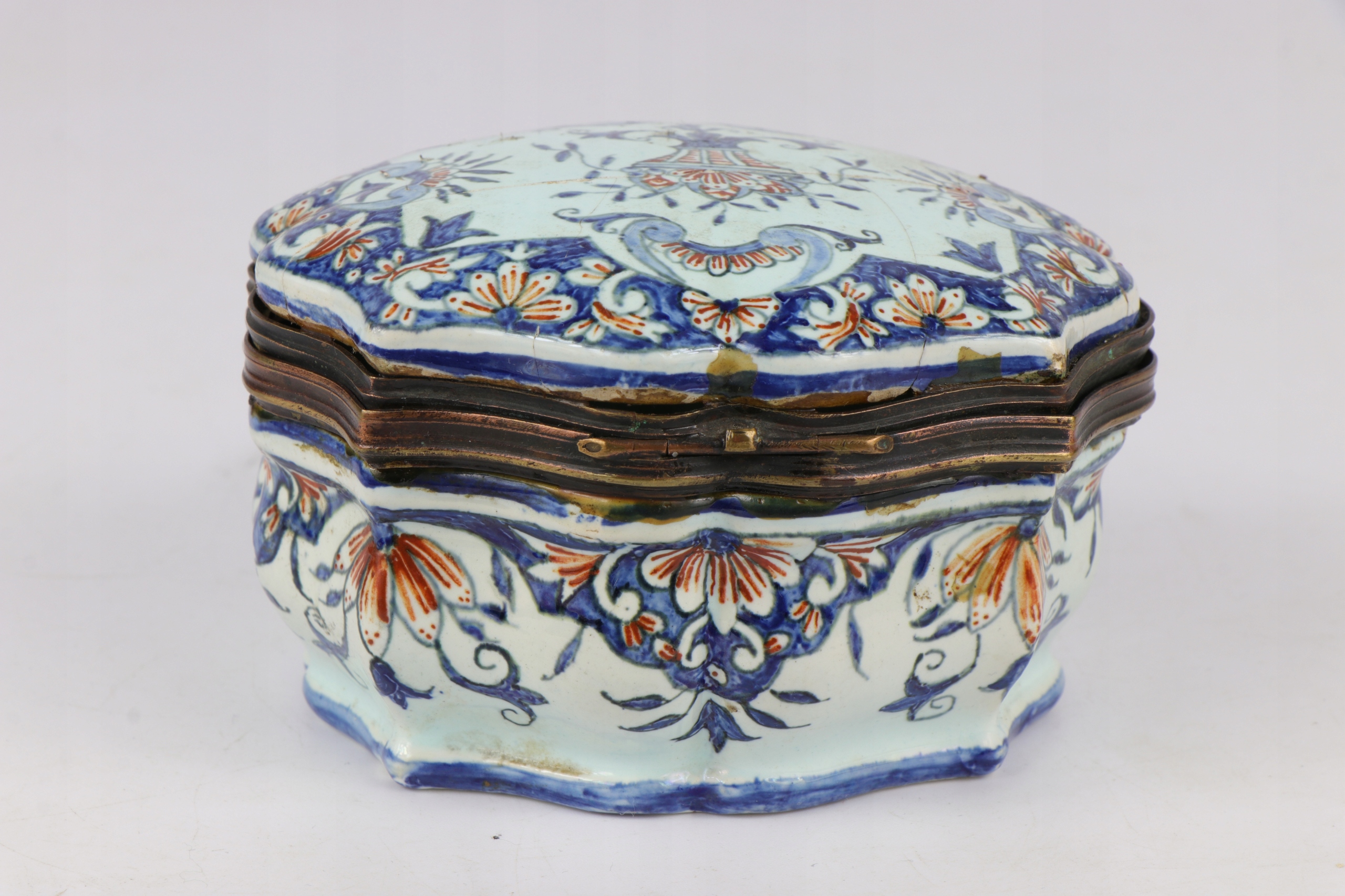-пленка и подписанный контейнер керамической шкатулки в стиле рококо продуктов руан. Ручная шкатулка, окрашенная в очень богатое украшение. Крышка и коробка в медной подгонке.