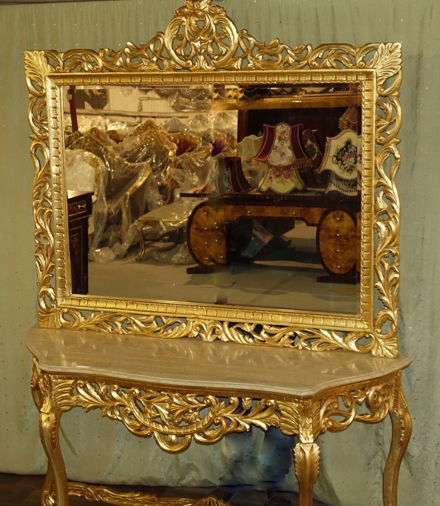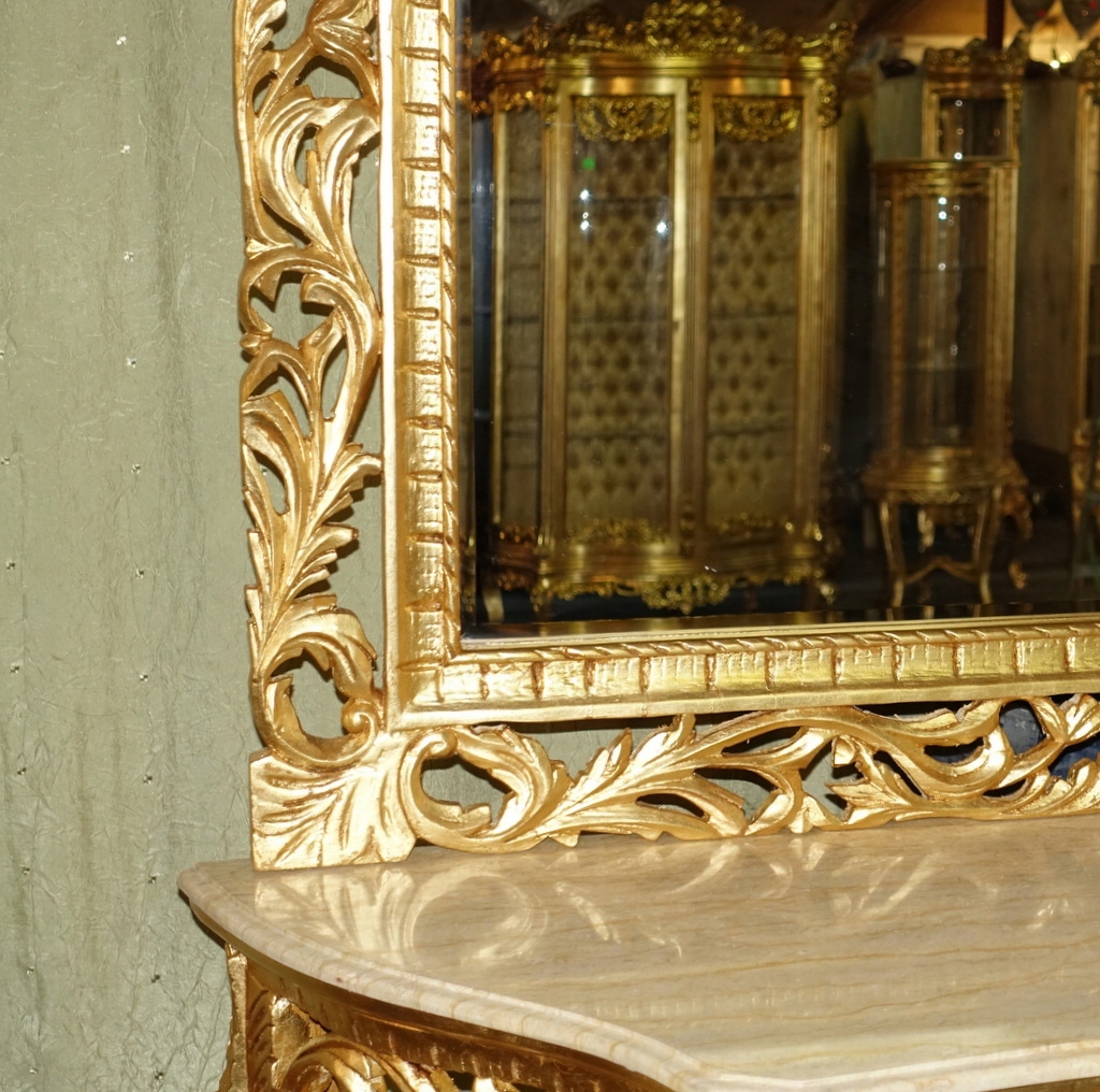 Предмет мебели восхищает своей уникальностью и качеством исполнения. Он новый, выполнен из дерева в стиле барокко. Зеркало с изящной ажурной скульптурой; особенно в короне. Мраморная столешница песочного цвета установлена на столь же красивой резной консоли. Дерево цвета старого золота. Консоль стоит на четырех стильно изогнутых ножках. Все это создает неразрывную гармонию.