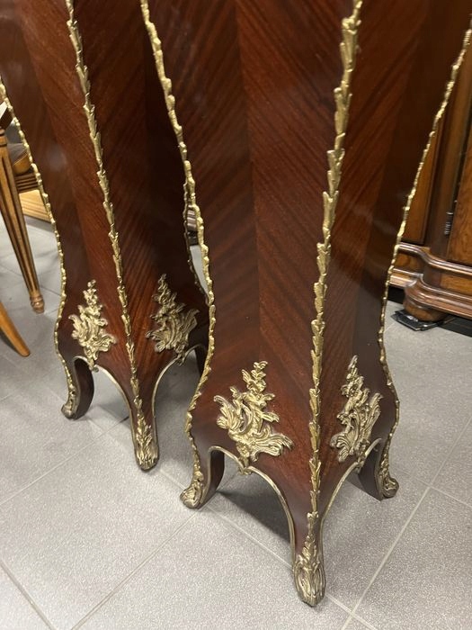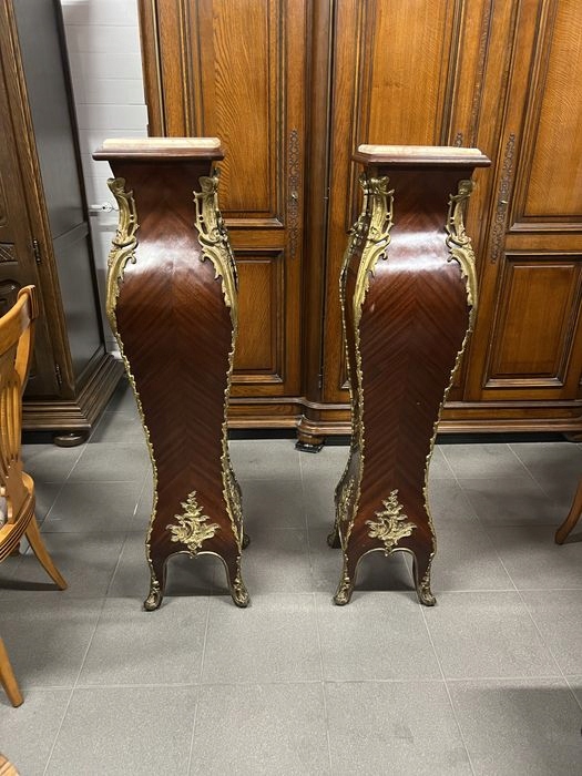 Предмет продажи — 2 колонны в стиле барокко. Очень хорошее состояние. Мраморные столешницы, латунная фурнитура. На них видны легкие следы времени. Цена указана за штуку. Возможность покупки в рассрочку. Возможен транспорт или личный самовывоз. Товар доступен в магазине в Пионках.