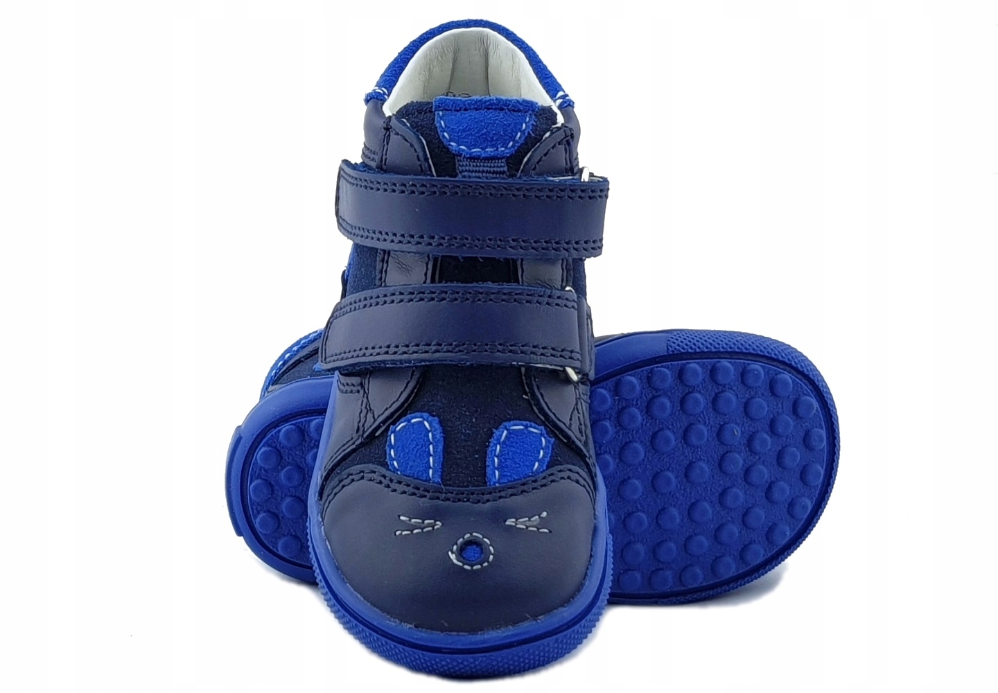 Джинсовая обувь известной компании Bartek, из коллекции животных, профилактическая обувь для наших детей. Обувь изготовлена из двух видов натуральной кожи: зернистой и нубука. На передней части туфель изображено животное с носом, что придает туфлям шарма. Туфли застегиваются на две застежки-липучки, поэтому их легко надеть и снять даже малышу.