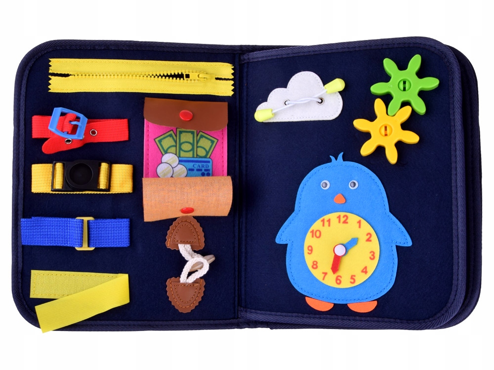 Внутри вы найдете несколько видов застежек, встречающихся в повседневной жизни: молнии, пряжки, кнопки, пуговицы, липучки и т. д., а также красочные фигурки различной формы, прикрепленные с помощью липучек, а также буквы алфавита и цифры. 0–9 вместе с знаками действий, которые будут использоваться для раннего обучения счету.