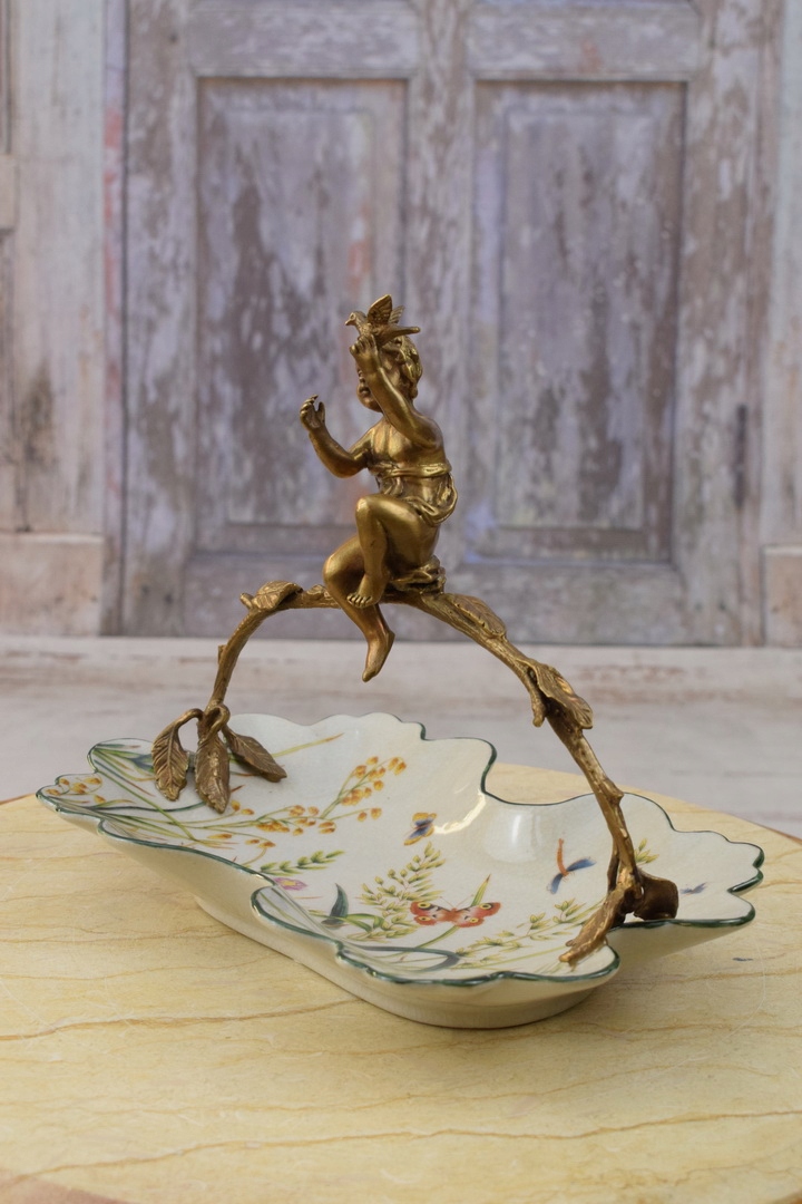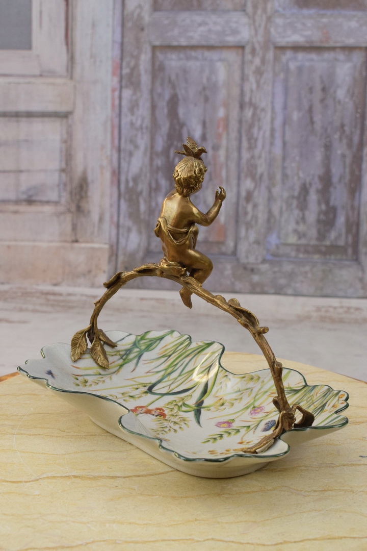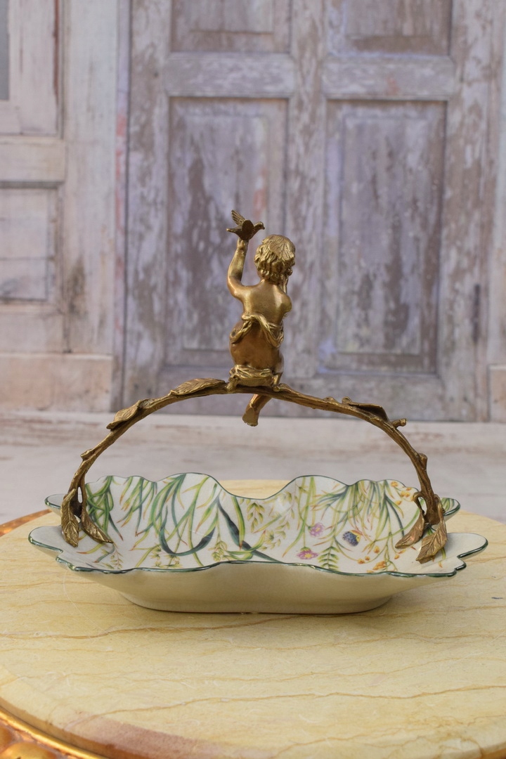 Барвисте порцелянове блюдо, кошик - бронзова фігура ангела, знак