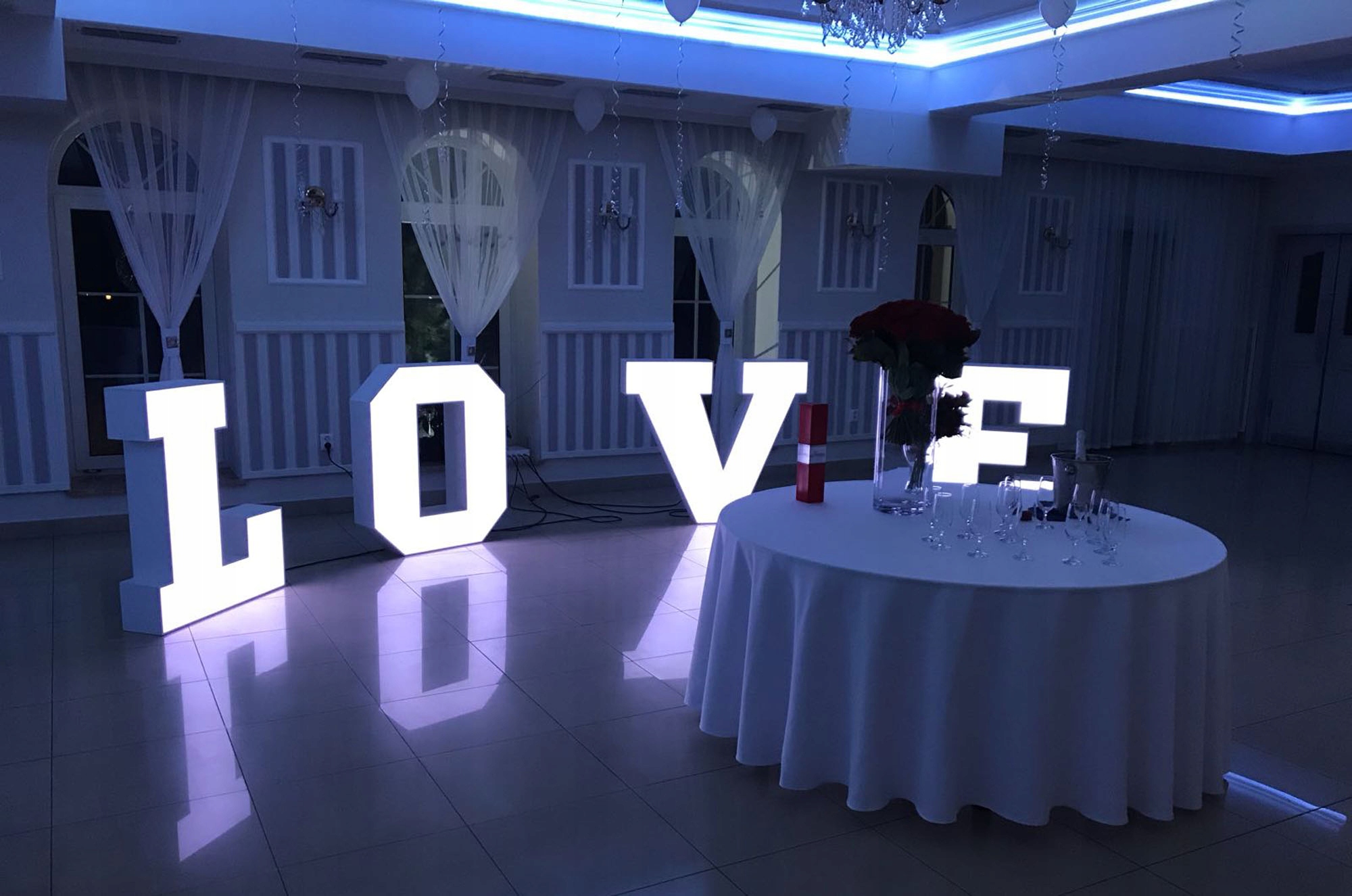 Высококачественный набор объемных букв, образующих слово LOVE, подсвеченных разноцветными светодиодными модулями RGB.