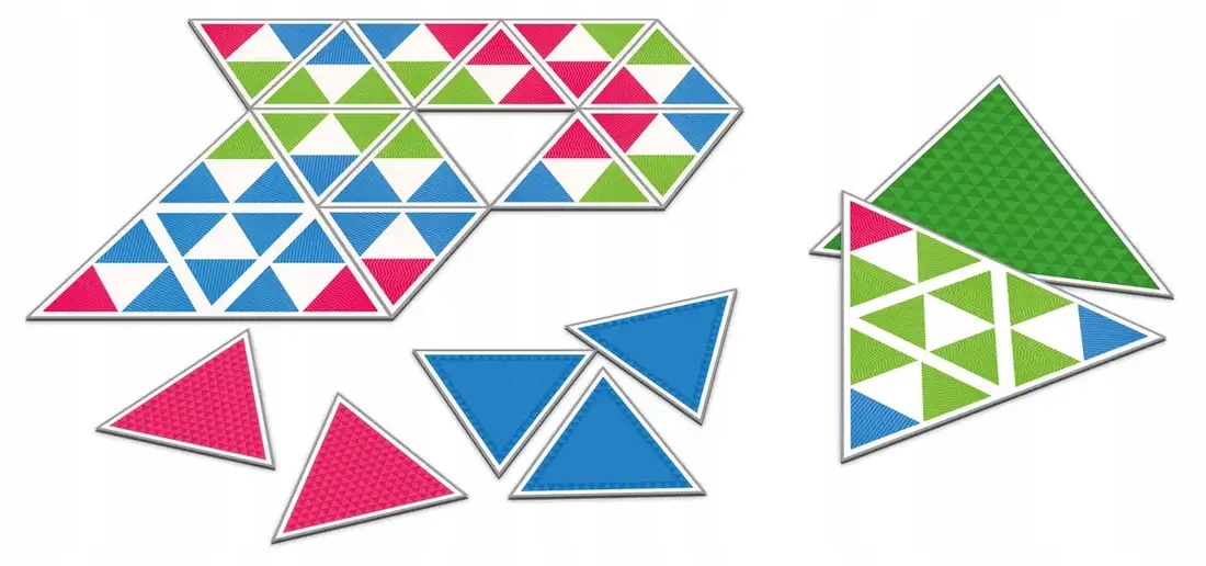 Игра для вечеринок, в которой вам нужно заточить зрение! Цель игры - умело добавить друг к другу больше треугольников. Добавленная плитка должна соответствовать всей стороне в сторону плитки на столе таким образом, что на плитках, которые связываются со всеми цветами (красный добавляется в красный, синий, синий и т. Д.).