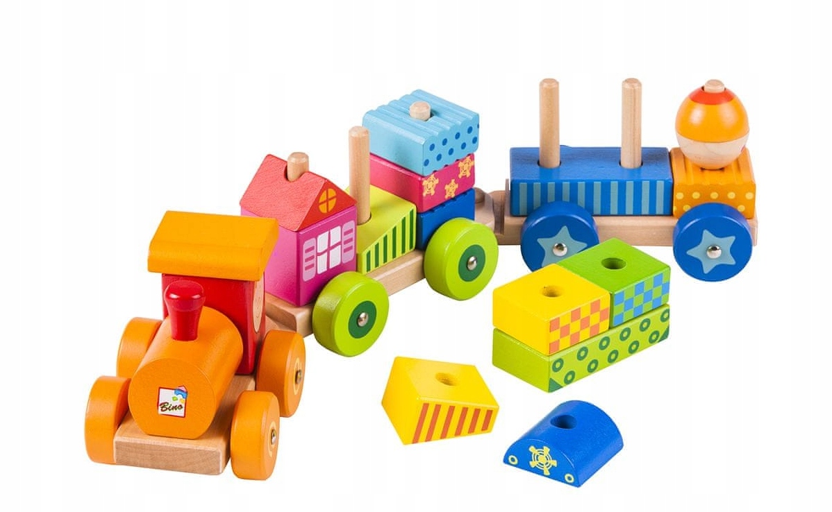 Деревянный поезд с блоками в веселых цветах для мелких строителей. 21 элемент. В коробке 43x10x10 см. Vhodné в течение 18 месяцев.