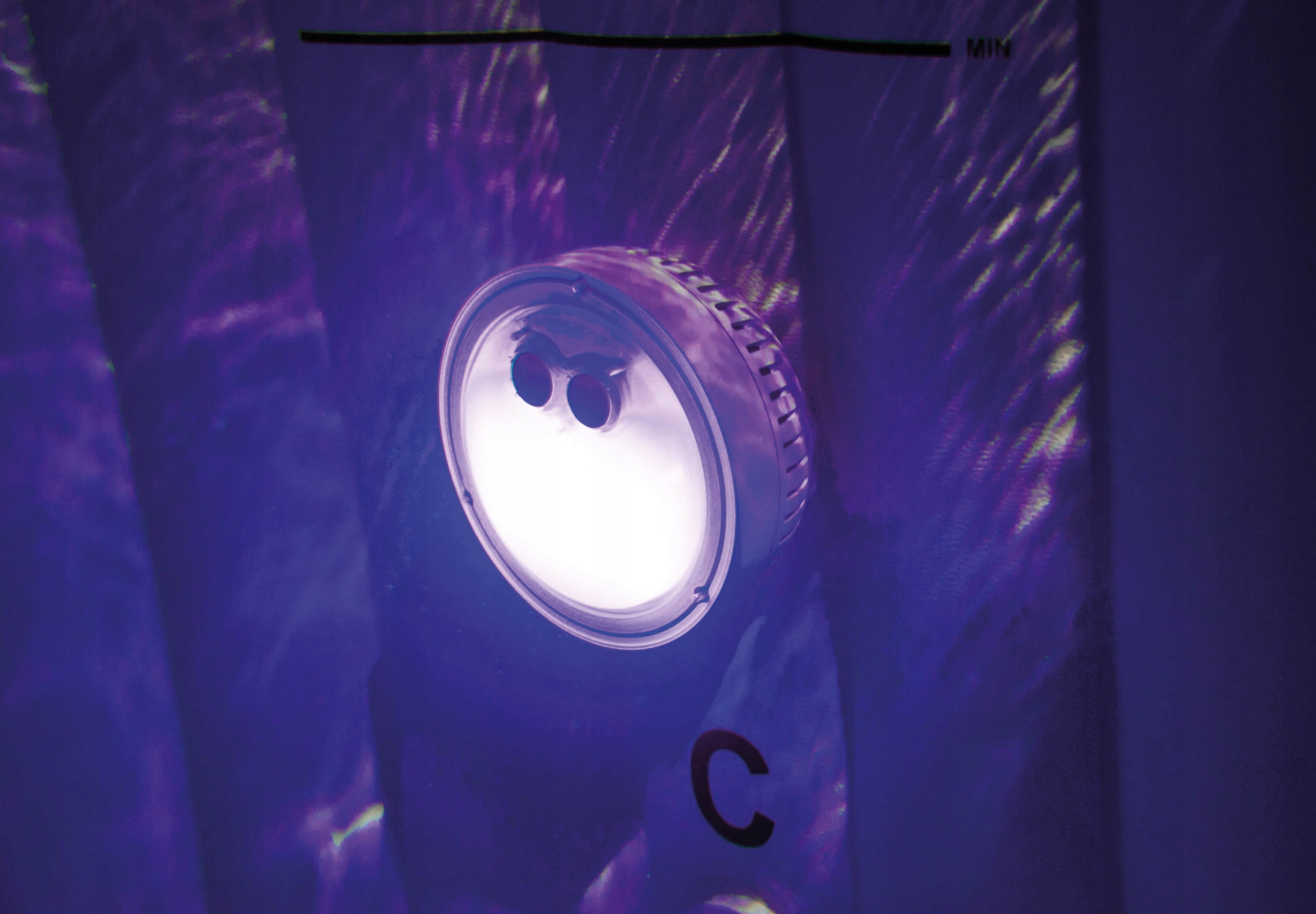 Лампа будет освещать спа в 5 цветах: белом, зеленом, морском, синем и фиолетовом. Он может светиться попеременно или постоянно одним цветом. Имеет систему автоматического отключения через 2 часа.