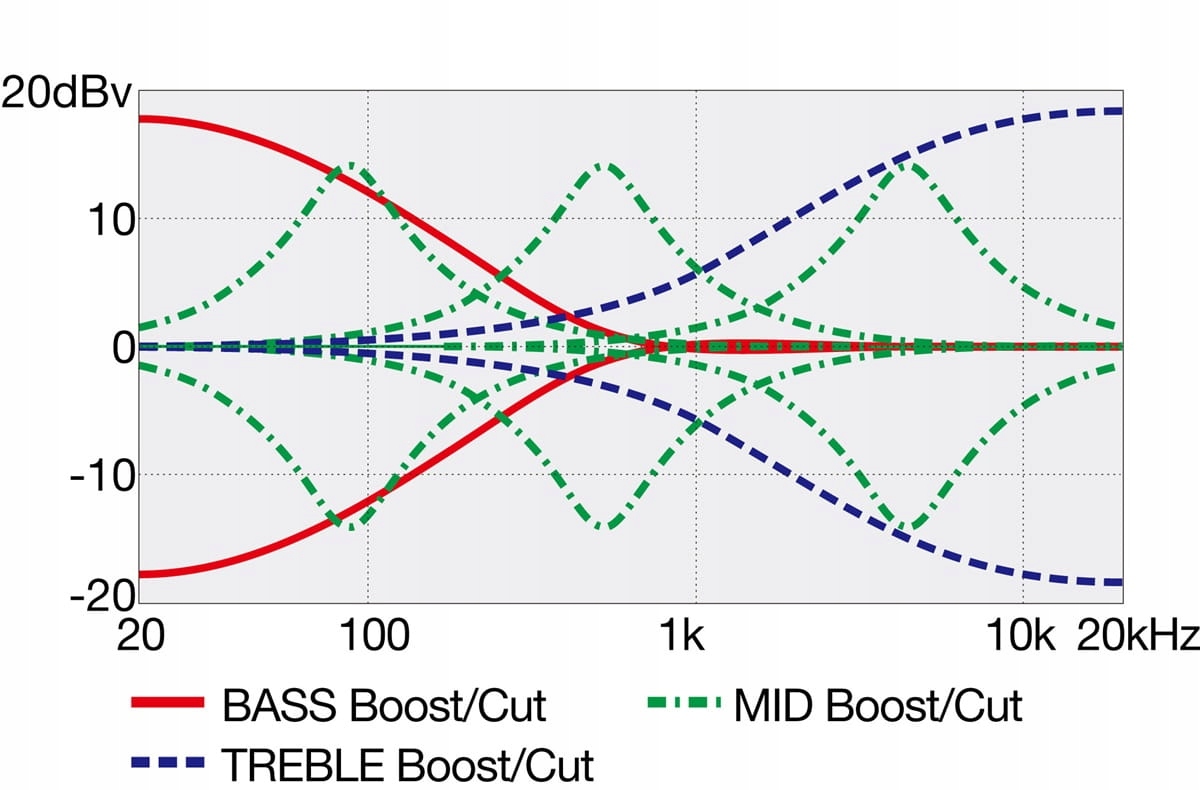 - Электроника: 3-полосный эквалайзер Vari-mid с переключателем обхода эквалайзера.