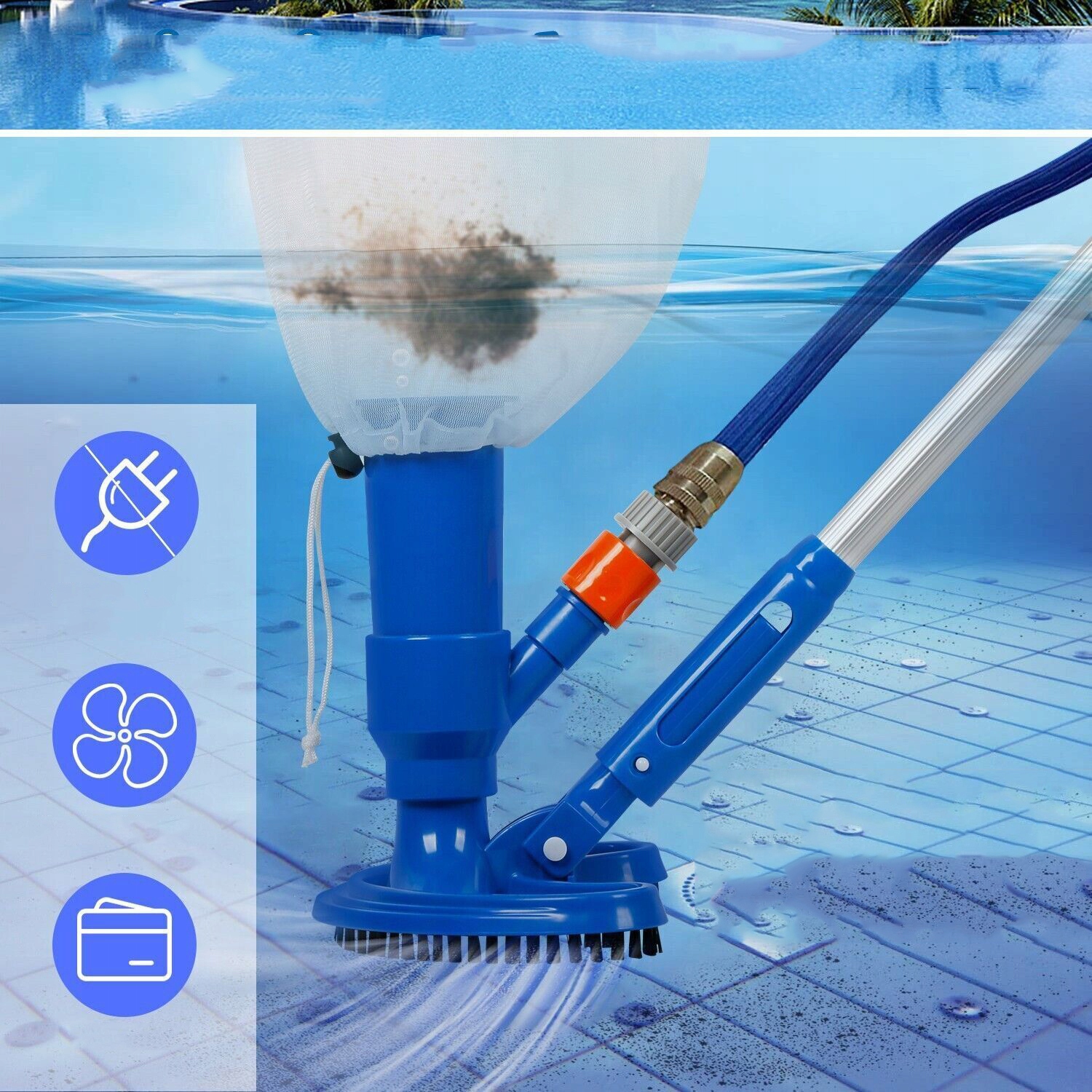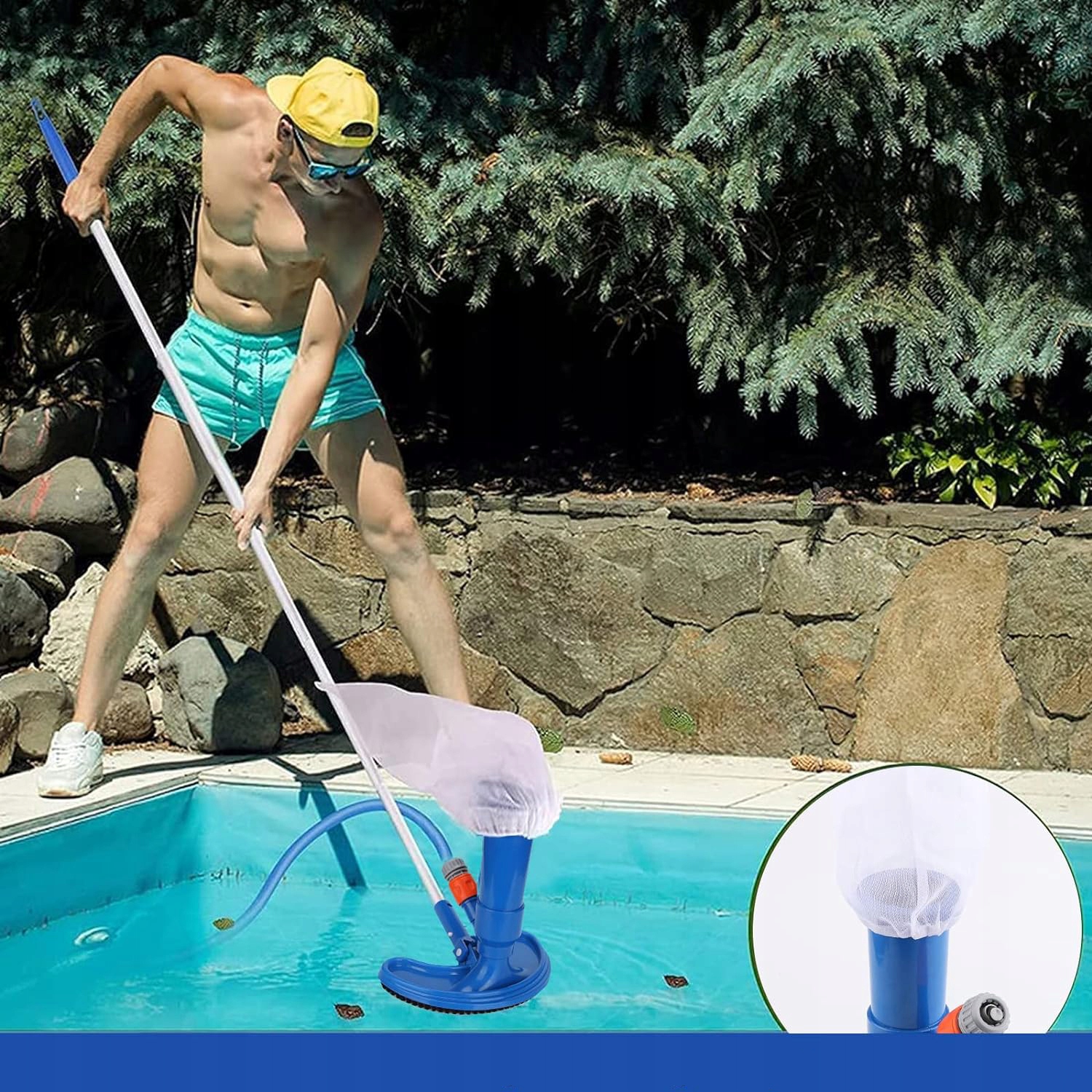 Вакуумный очиститель работает без насоса - просто подключите садовый шланг. Сетка готова сразу после распаковки.