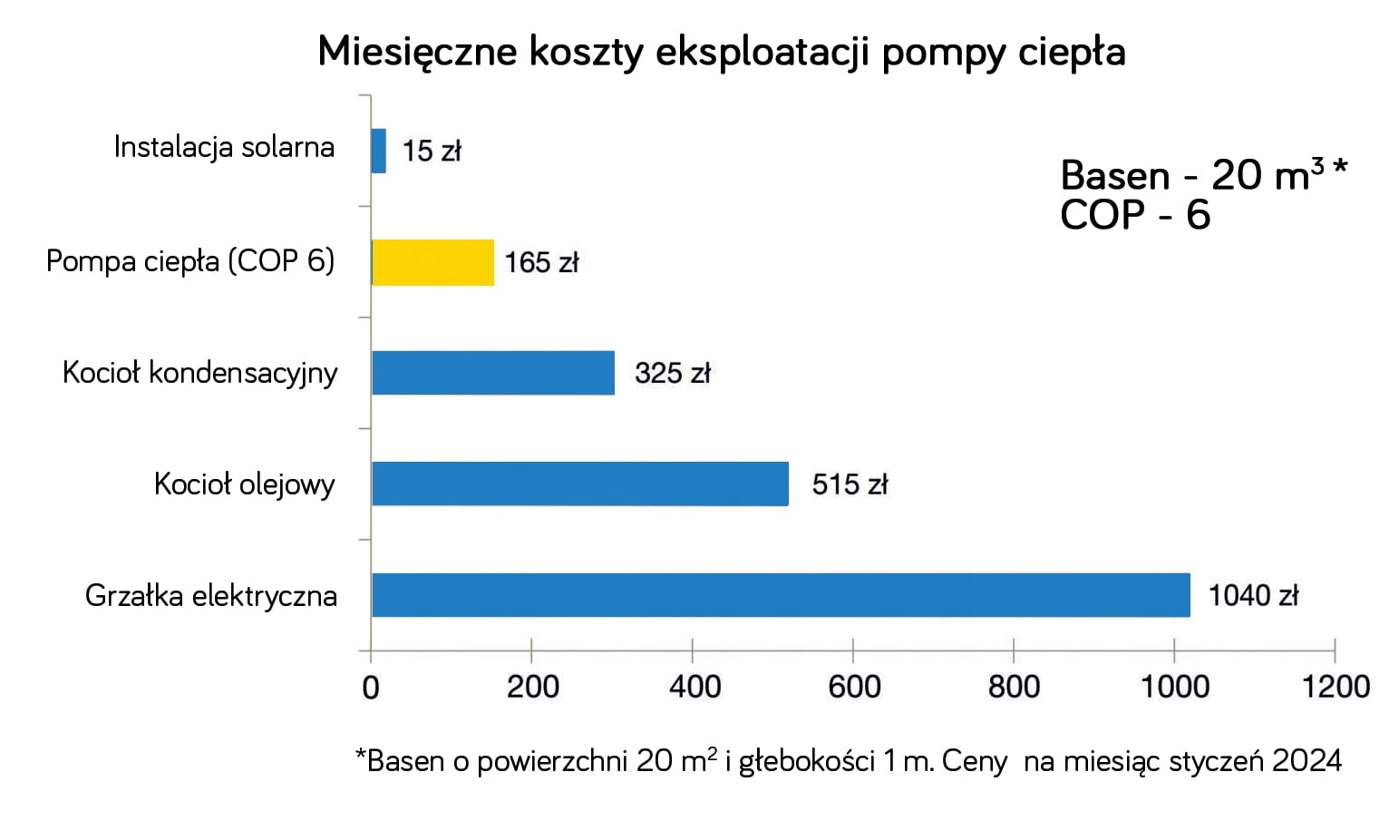 Потребление электроэнергии с помощью нагревательной воды теплового насоса в бассейне будет в среднем в 5-6 раз по сравнению с электрическим нагревателем. Эффективность насоса полицейского насоса 6, вызывает только 1 кВт -ч электроэнергии для производства 6 кВт -ч. Для среднего бассейна с вместимостью 20 м³ нам необходимо обеспечить около 900 кВт -ч на тепло летом, чтобы поддерживать необходимую температуру воды в бассейне.