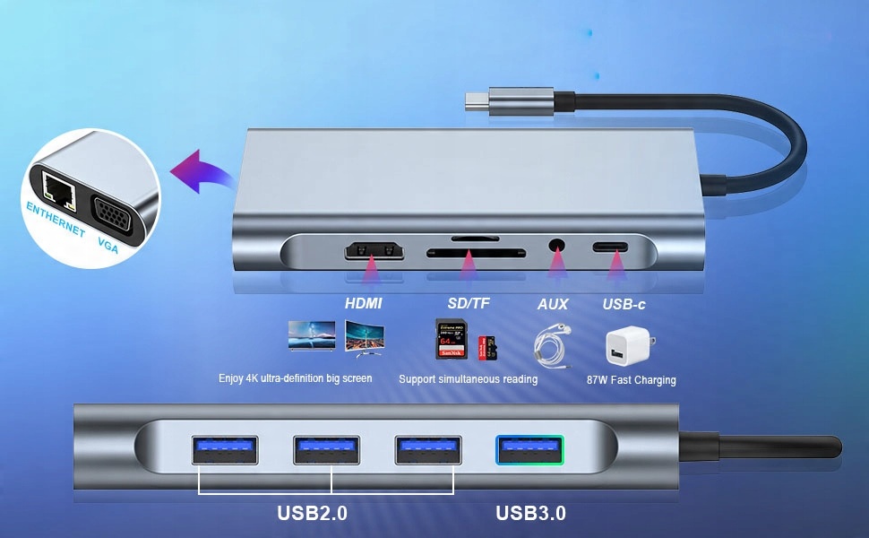 USB C Hub имеет разъем зарядки USB-C с функцией питания, интерфейс USB3.0, 3 × USB2.0, быстро зарядка PD, интерфейс HDMI 4K, интерфейс VGA, карта SD / TF, карта SD / TF, карта SDMI. 3,5 мм аудио -выходной интерфейс. Вы можете подключить клавиатуру, мышь, USB -контроллер и внешний жесткий диск к устройству C. Это отличная док -станция для ноутбука, особенно отличная док -станция для MacBook Pro