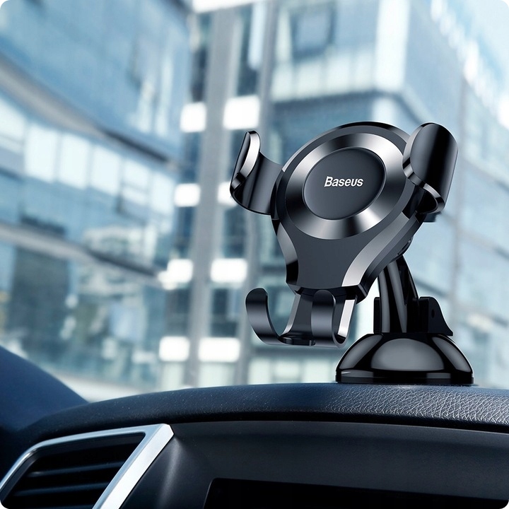 Автомобильный держатель для телефона крепится на кабину, доску или другую плоскую поверхность. Он имеет гравитационную технологию, благодаря которой он автоматически затягивается под действием веса вставленного в него устройства. Прочный зажим обеспечивает стабилизацию и безопасность телефона даже на очень сложных дорогах.