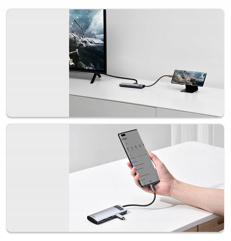 На этом возможности не заканчиваются! С помощью док-станции Baseus вы можете, например, превратить свой телефон в хост, который идеально подходит для мобильной работы. Устройство также поддерживает функцию OTG. Это означает, что вы можете использовать его, например, для вывода изображений с совместимых смартфонов на большой экран или подключения к портативным накопителям.