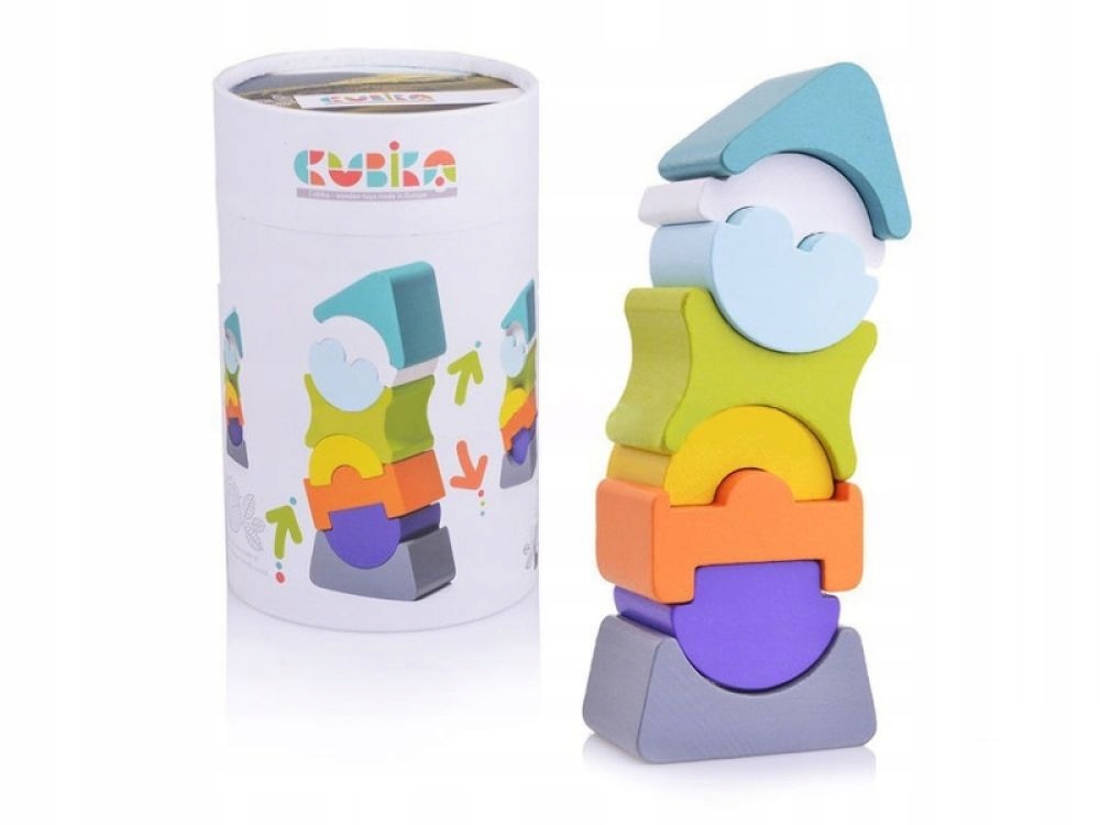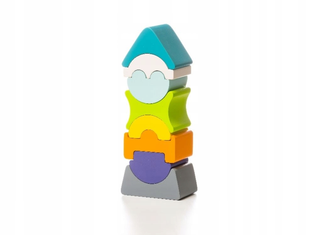 Игрушка состоит из восьми блоков, различающихся по цвету и форме. Чтобы построить башню, ребенок должен соединить вырезы так, чтобы они совпадали друг с другом. Более того, особая конструкция блоков позволяет башне наклоняться в двух направлениях.