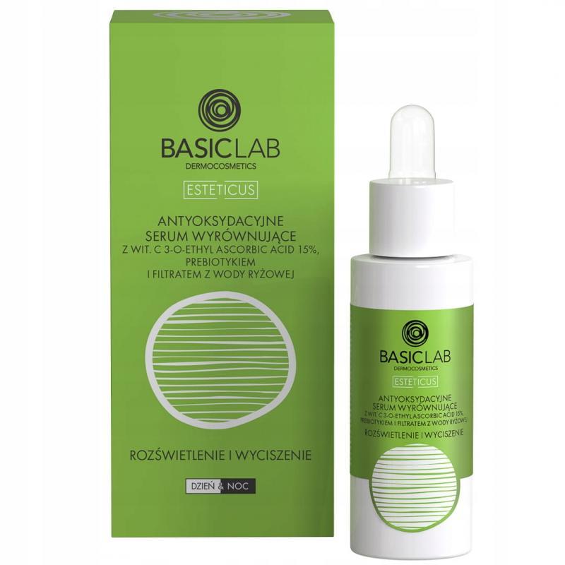 Антиоксидантная сыворотка BasicLab Esteticus для равномерного осветления и успокоения с 15 % витамина С в форме 3-O-этиласкорбиновой кислоты.