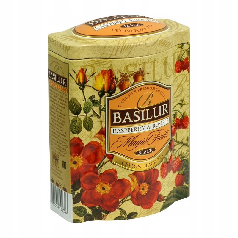 Чай Basilur Raspberry & Rosehip — элитный черный крупнолистовой чай сорта FBOP с добавлением плодов малины, папайи и шиповника. Обозначение FBOP представляет собой аббревиатуру Flower Broken Orange Pekoe, что означает, что для производства чая использовались сломанные верхние листья куста и бутоны (кончики). Чай отличается сильным, характерным ароматом и фруктовым вкусом. Чай Basilur упакован в декоративную жестяную банку, что делает его идеальным в качестве подарка.