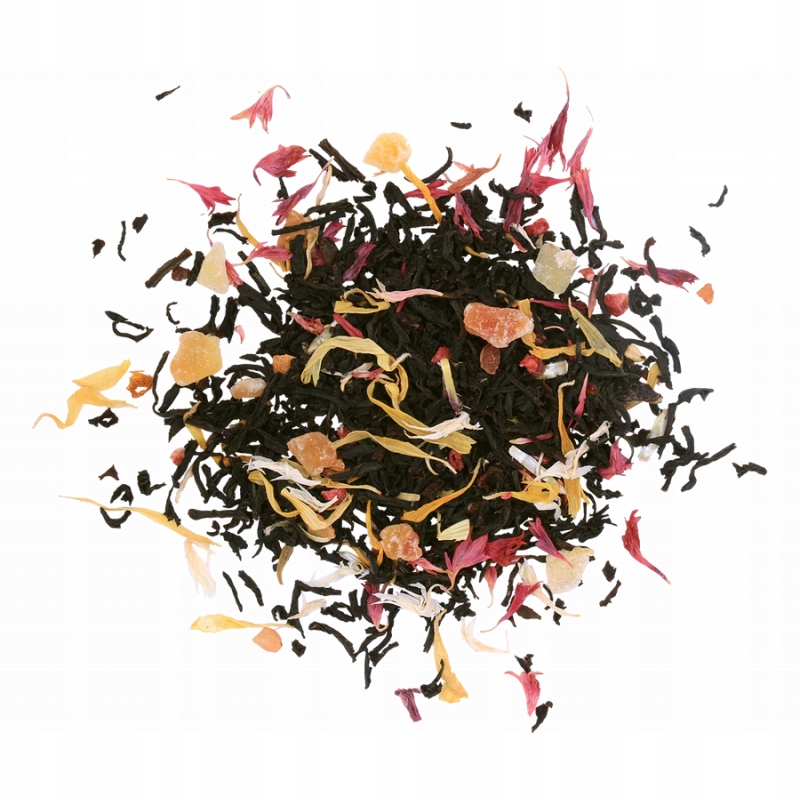 Состав: черный листовой цейлонский чай (87%) с малиной. (0,5%), папайя (6%), шиповник (1%), бархатцы (0,5%), василек (0,5%) и малиновый ароматизатор (4,5%).