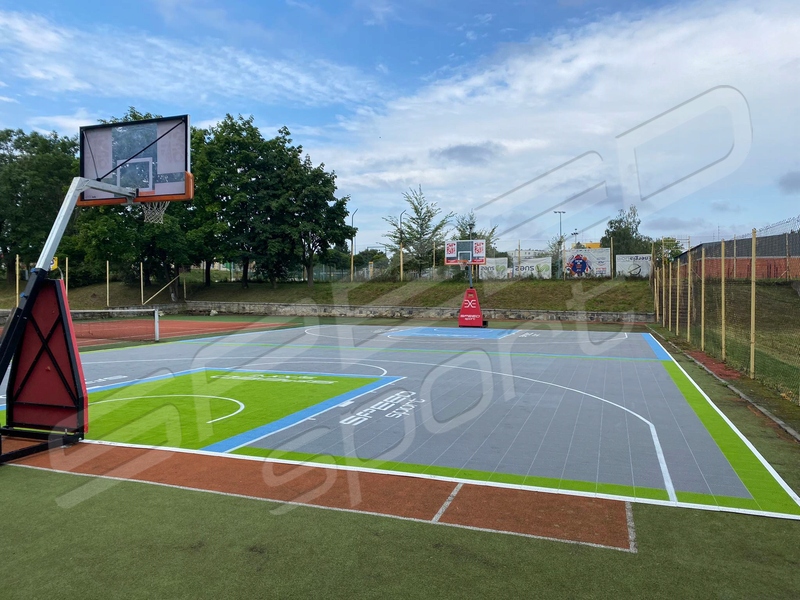 Покрытие HEXA POWER PRO с линиями баскетбольной площадки 3х3 и логотипами производителя, которые также являются названием турнирной серии.