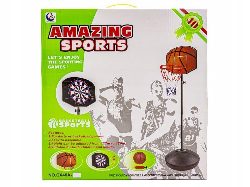 Ширина доски: около 40,5 см. Высота доски: около 30,5 см. Диаметр обода: 25 см. Диаметр основания: 39 см. Диаметр шарика: около 14 см. Регулируемая высота подставки: от края 99–140 см. Общая высота: 127–170 см. Упаковка: 41 шт. х 38,5 х 19 см