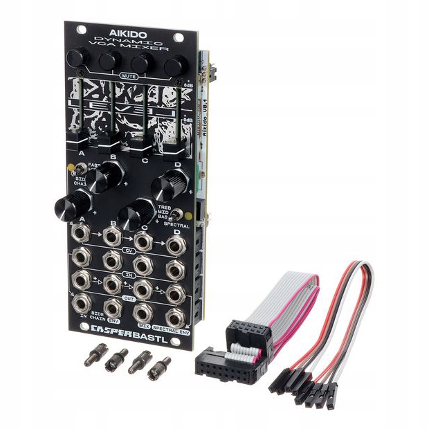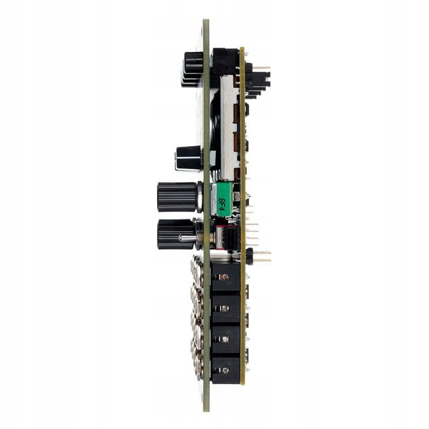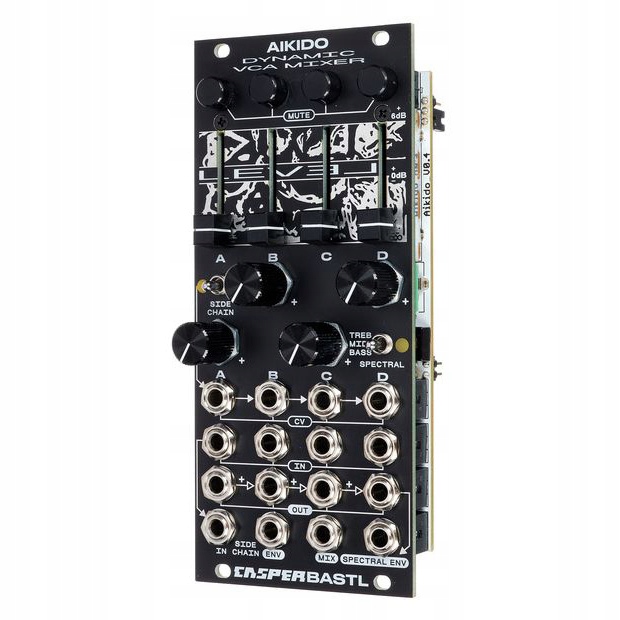 - 4 идентичных канала VCA, каждый с регулировкой уровня (с усилением 6 дБ), отключением звука, входом CV и входом/выходом сигнала.