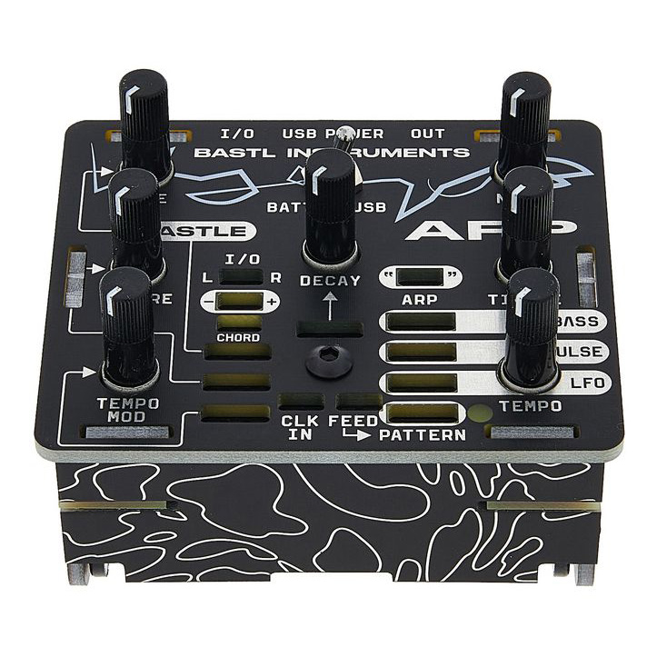 Bastl Instruments Kastle ARP — модульный мини-синтезатор с секвенсором — синусоидальный генератор с квантователем высоты тона и цифровым формирователем волны — ручка управления нотами для выбора высоты тона и ручка управления аккордами для выбора аккорда трезвучия — режим загрузки позволяет устанавливать основную ноту и точно Настройка - Управление тембром (формирователь волны) с входом модуляции и аттенюатором - Регулируемая огибающая затухания - Отдельные выходы для сигналов Arp и Bass - Внутренний LFO с треугольной и импульсной формой волны - Тактовый вход и точки подключения для управления внутренним секвенсором / регистром сдвига - Точки подключения для подключение к внешнему выходу для наушников/кабеля (разъем 3,5 мм) - питание от батареек (3 шт. типа АА) или порта Micro USB (батарейки и блок питания в комплект не входят) - размеры (ШxГxВ): 70 x 60 x 50 мм - включая 10 шт. соединительные кабели